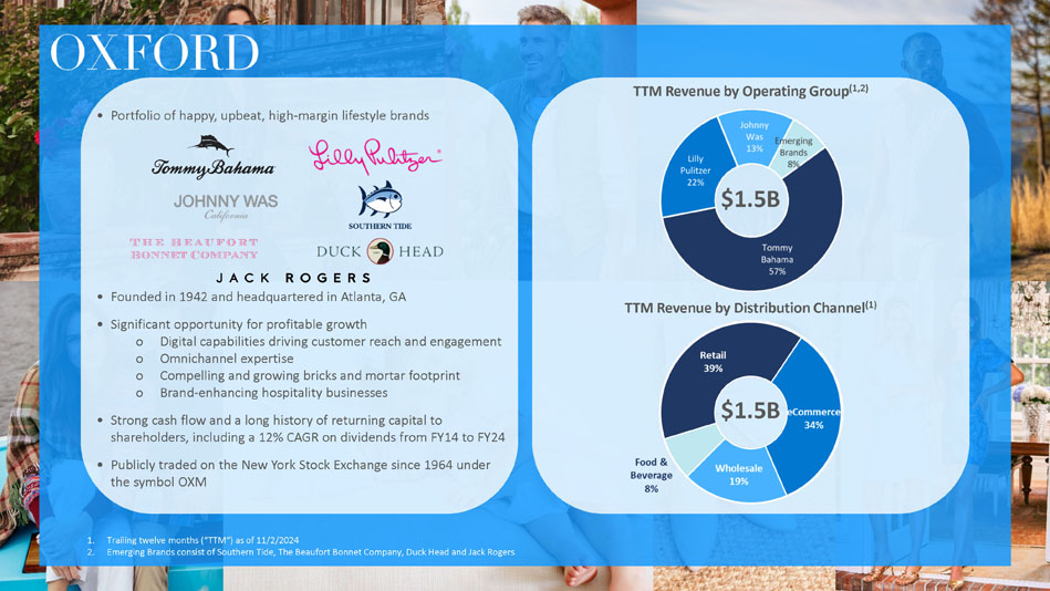 • Portfolio of happy, upbeat, high - margin lifestyle brands • Founded in 1942 and headquartered in Atlanta, GA • Significant opportunity for profitable growth o Digital capabilities driving customer reach and engagement o Omnichannel expertise o Compelling and growing bricks and mortar footprint o Brand - enhancing hospitality businesses • Strong cash flow and a long history of returning capital to shareholders, including a 12% CAGR on dividends from FY14 to FY24 • Publicly traded on the New York Stock Exchange since 1964 under the symbol OXM TTM Revenue by Distribution Channel (1) TTM Revenue by Operating Group (1,2) $1.5B $1.5B 1. Trailing twelve months (“ TTM “) as of 11/2/2024 2. Emerging Brands consist of Southern Tide, The Beaufort Bonnet Company, Duck Head and Jack Rogers