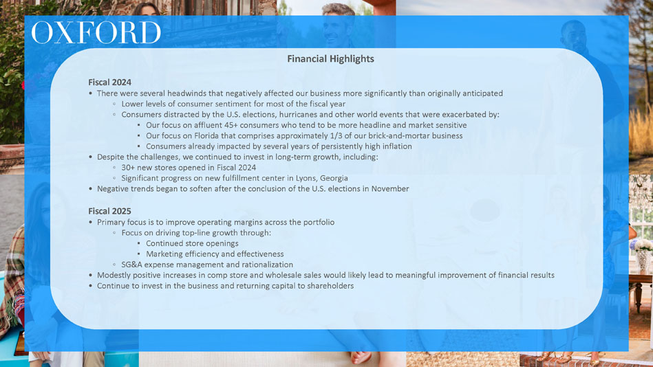 Financial Highlights Fiscal 2024 • There were several headwinds that negatively a ffected our business more significantly than originally anticipated ◦ Lower levels of consumer sentiment for most of the fiscal year ◦ Consumers distracted by the U.S. elections, hurricanes and other world events that were exacerbated by: ▪ Our focus on affluent 45+ consumers who tend to be more headline and market sensitive ▪ Our focus on Florida that comprise s approximately 1/3 of our brick - and - mortar business ▪ Consumers already impacted by several years of persistently high inflation • Despite the challenges, we continued to invest in long - term growth, including : ◦ 30+ new stores opened in Fiscal 2024 ◦ Significant progress on new fulfillment center in Lyons, Georgia • Negative trends began to soften after the conclusion of the U.S. elections in November Fiscal 2025 • Primary focus is to improve operating margins across the portfolio ◦ Focus on driving top - line growth through: ▪ Continued store openings ▪ Marketing efficiency and effectiveness ◦ SG&A expense management and rationalization • Modestly positive increases in comp store and wholesale sales would likely lead to meaningful improvement of financial result s • Continue to invest in the business and returning capital to shareholders