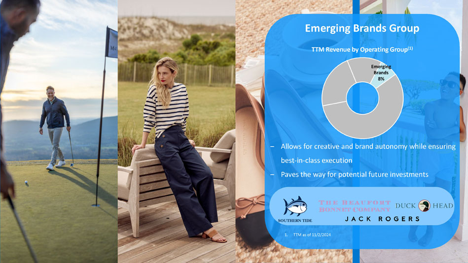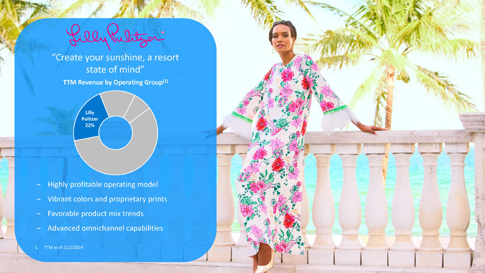 ‒ Highly profitable operating model ‒ Vibrant colors and proprietary prints ‒ Favorable product mix trends ‒ Advanced omnichannel capabilities “Create your sunshine, a resort state of mind” TTM Revenue by Operating Group (1) 1. TTM as of 11/2/2024