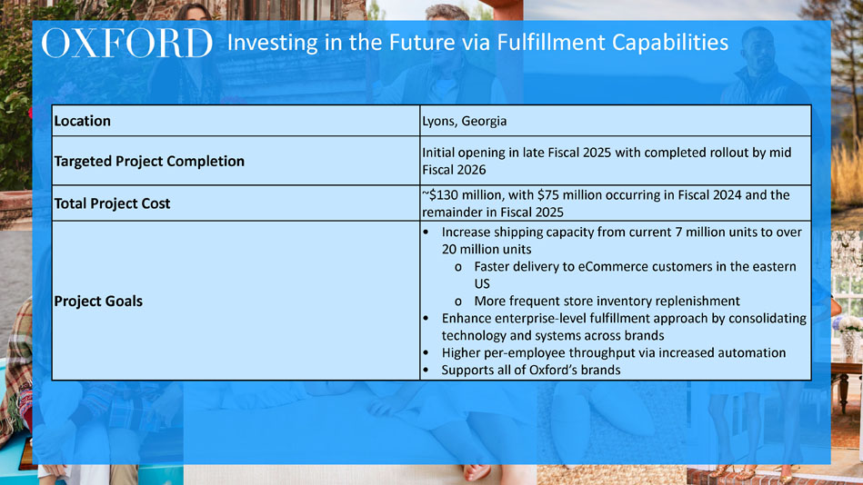 Lyons, Georgia Location Initial opening in late Fiscal 2025 with completed rollout by mid Fiscal 2026 Targeted Project Completion ~$130 million, with $75 million occurring in Fiscal 2024 and the remainder in Fiscal 2025 Total Project Cost • Increase shipping capacity from current 7 million units to over 20 million units o Faster delivery to eCommerce customers in the eastern US o More frequent store inventory replenishment • Enhance enterprise - level fulfillment approach by consolidating technology and systems across brands • Higher per - employee throughput via increased automation • Supports all of Oxford’s brands Project Goals Investing in the Future via Fulfillment Capabilities
