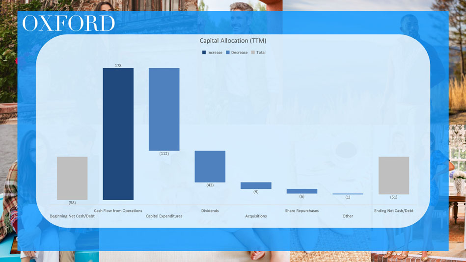 (58) 178 (112) (43) (9) (6) (1) (51) Beginning Net Cash/Debt Cash Flow from Operations Capital Expenditures Dividends Acquisitions Share Repurchases Other Ending Net Cash/Debt Capital Allocation (TTM) Increase Decrease Total