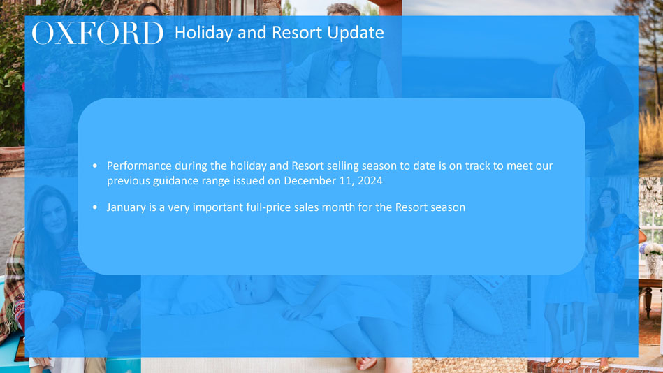 • Performance during the holiday and Resort selling season to date is on track to meet our previous guidance range issued on December 11, 2024 • January is a very important full - price sales month for the Resort season Holiday and Resort Update