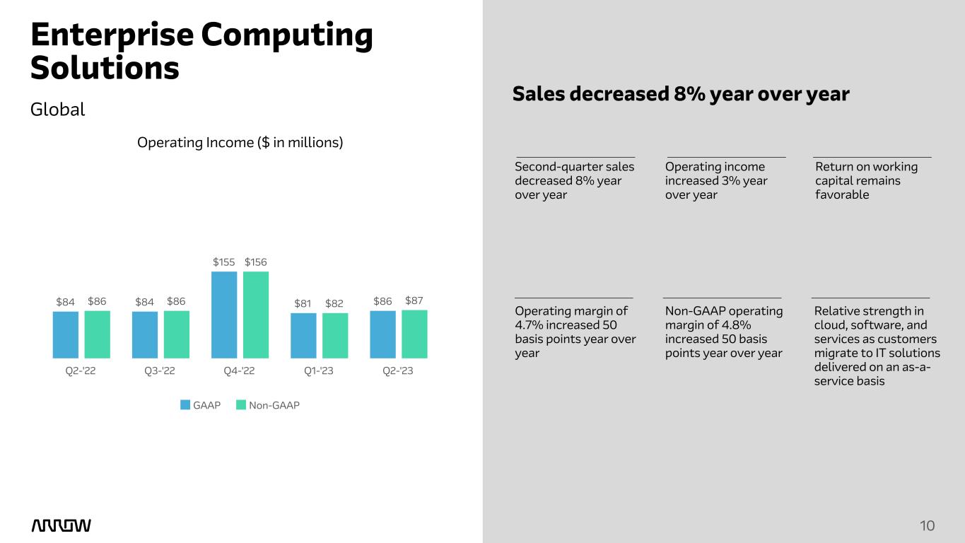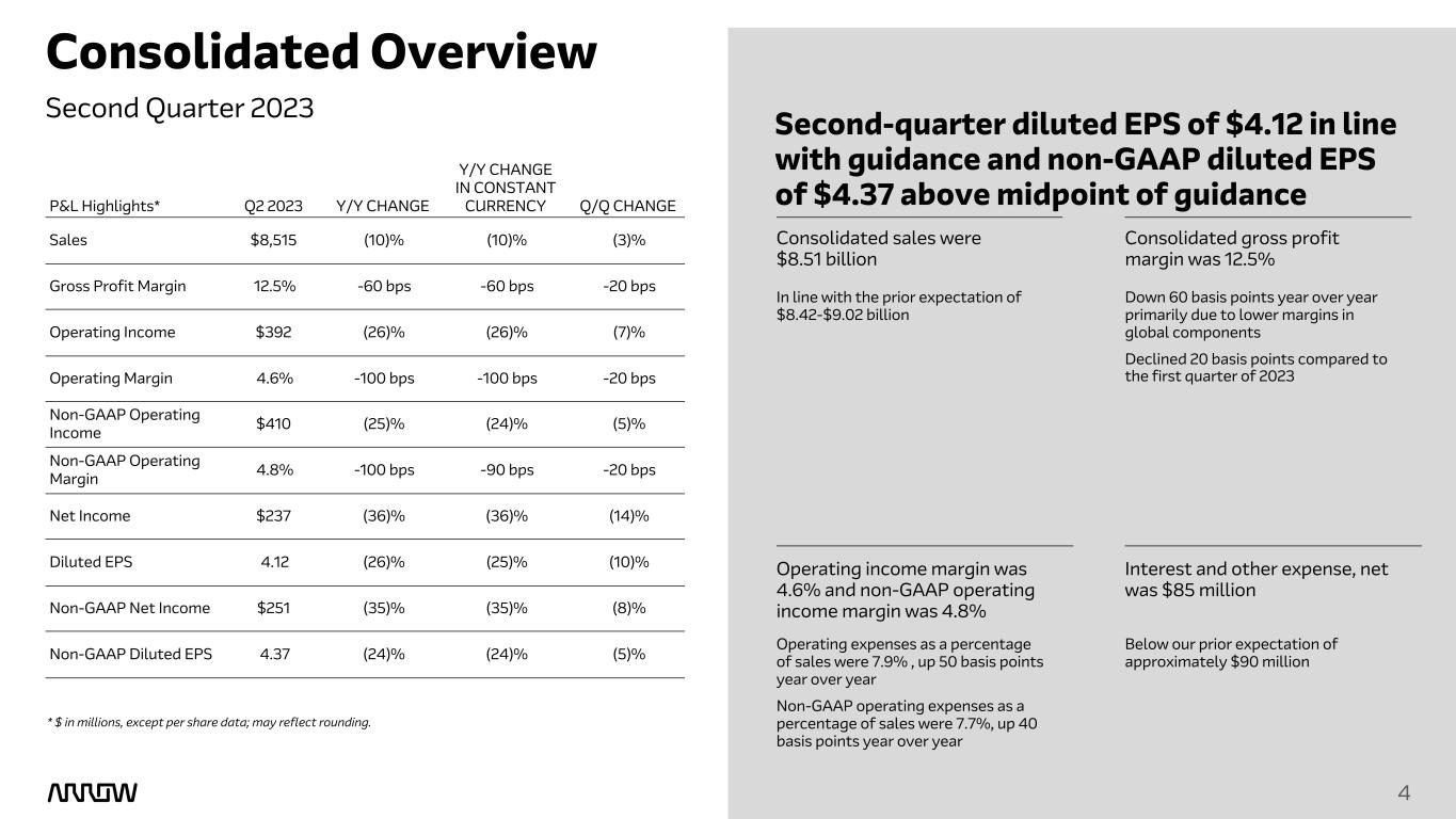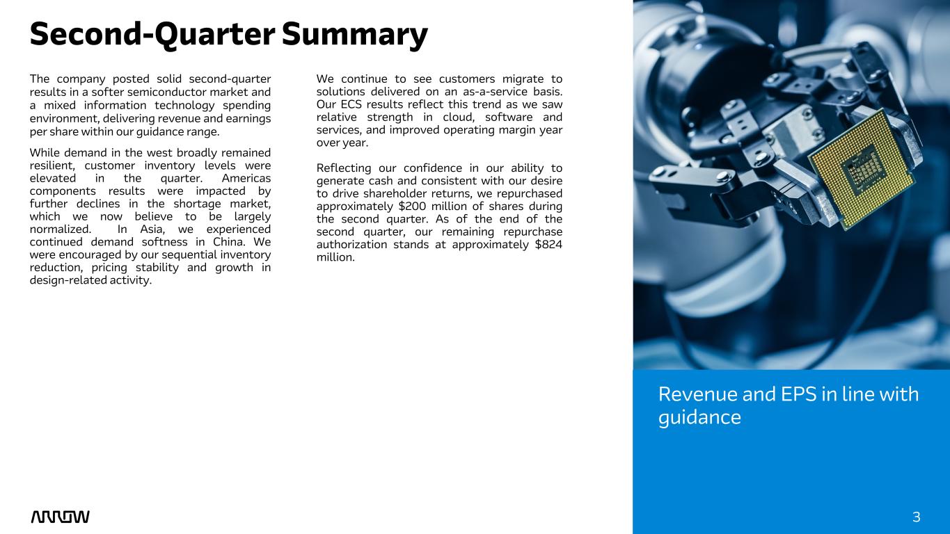 3 3 Second-Quarter Summary We continue to see customers migrate to solutions delivered on an as-a-service basis. Our ECS results reflect this trend as we saw relative strength in cloud, software and services, and improved operating margin year over year. Reflecting our confidence in our ability to generate cash and consistent with our desire to drive shareholder returns, we repurchased approximately $200 million of shares during the second quarter. As of the end of the second quarter, our remaining repurchase authorization stands at approximately $824 million. The company posted solid second-quarter results in a softer semiconductor market and a mixed information technology spending environment, delivering revenue and earnings per share within our guidance range. While demand in the west broadly remained resilient, customer inventory levels were elevated in the quarter. Americas components results were impacted by further declines in the shortage market, which we now believe to be largely normalized. In Asia, we experienced continued demand softness in China. We were encouraged by our sequential inventory reduction, pricing stability and growth in design-related activity. Revenue and EPS in line with guidance