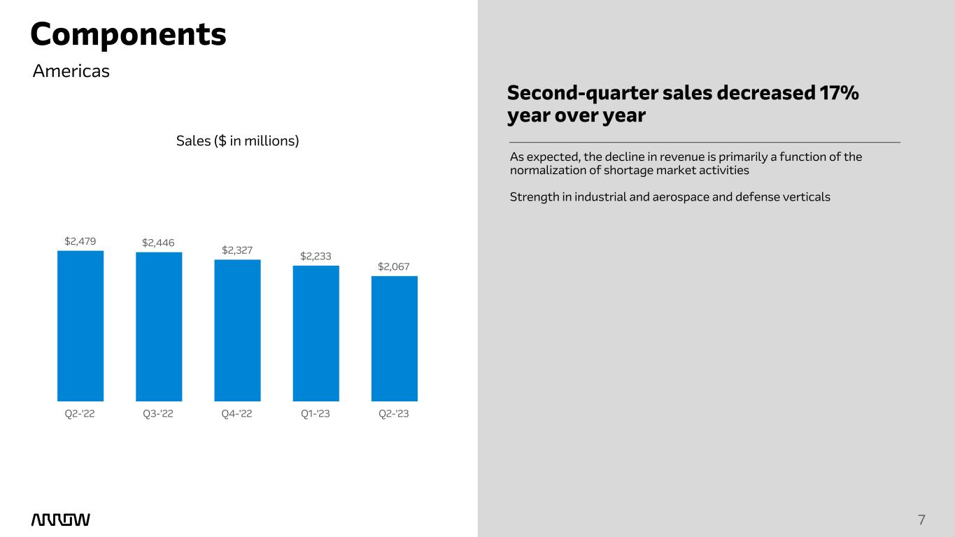 6 6 Components Global Second-quarter sales decreased 10% year over year Second-quarter sales decreased 10% year over year Lead times are improving Operating margin of 5.7% decreased 130 basis points year over year due to the shortage market conditions Non-GAAP operating margin of 5.8% decreased 130 basis points year over year Return on working capital decreased year over year but remained at favorable levels Operating Income ($ in millions) $524 $495 $443 $418 $381 $531 $501 $449 $424 $388 GAAP Non-GAAP Q2-'22 Q3-'22 Q4-'22 Q1-'23 Q2-'23 Sales of $6.68 billion were in line with the prior expectation of $6.64-$7.04 billion Book to bill was below parity but has remained steady