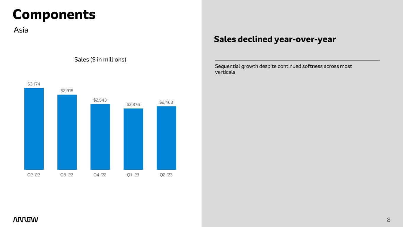 7 7 Components As expected, the decline in revenue is primarily a function of the normalization of shortage market activities Strength in industrial and aerospace and defense verticals Sales ($ in millions) Americas Second-quarter sales decreased 17% year over year $2,479 $2,446 $2,327 $2,233 $2,067 Q2-'22 Q3-'22 Q4-'22 Q1-'23 Q2-'23