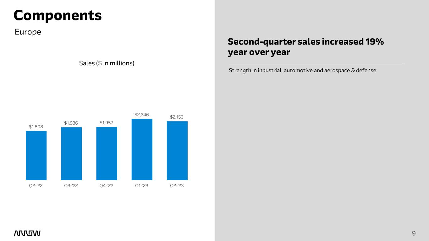8 8 Components Sales ($ in millions) Asia Sales declined year-over-year $3,174 $2,919 $2,543 $2,376 $2,463 Q2-'22 Q3-'22 Q4-'22 Q1-'23 Q2-'23 Sequential growth despite continued softness across most verticals