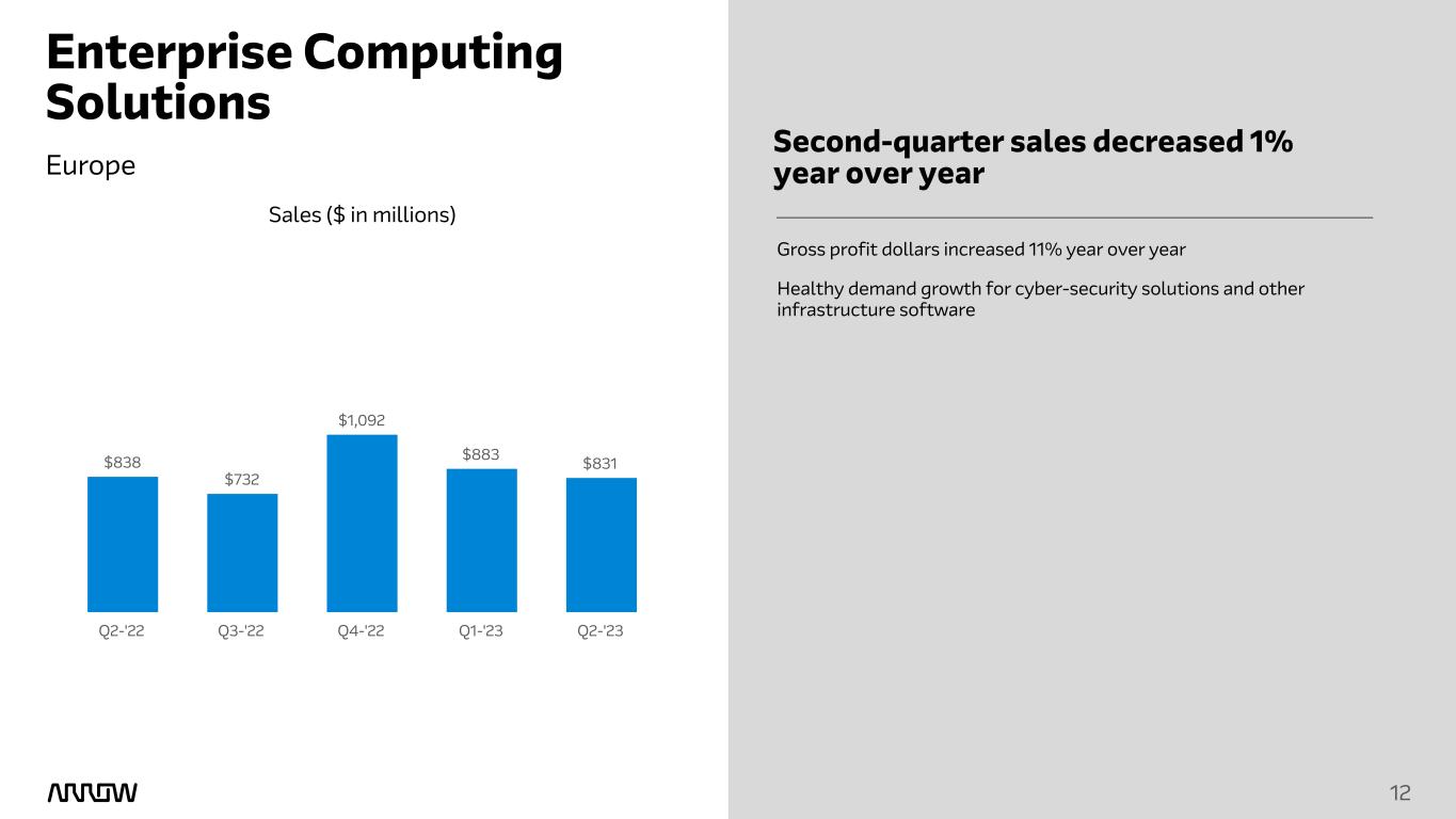 11 Gross profit dollars increased slightly year over year Relative strength in the public sector 11 Sales ($ in millions) Americas Sales decreased 14% year over year $1,161 $1,234 $1,404 $998 $1,001 Q2-'22 Q3-'22 Q4-'22 Q1-'23 Q2-'23 Enterprise Computing Solutions Gross profit dollars increased slightly year over year Relative strength in the public sector