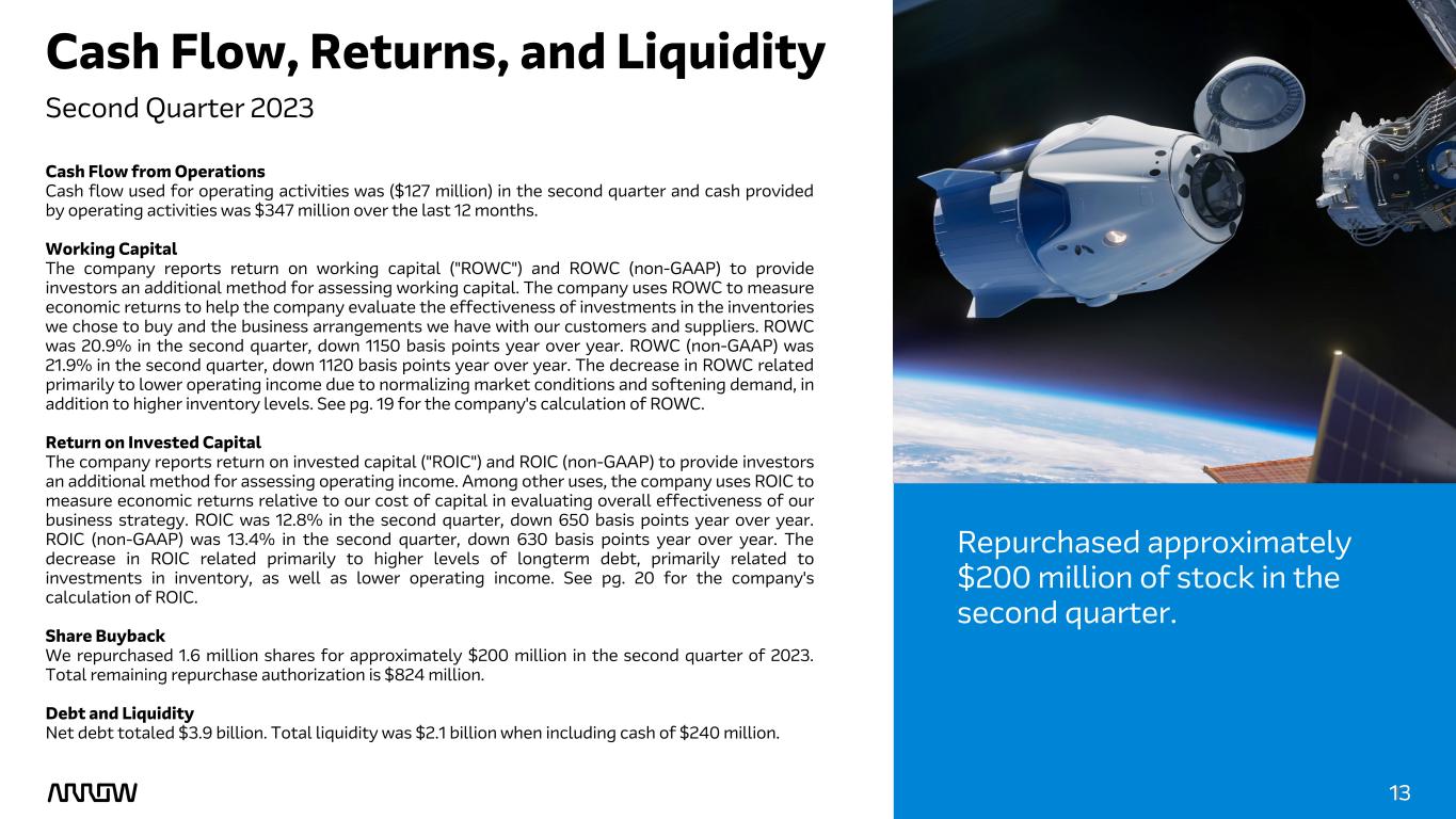 13 131 Cash Flow from Operations Cash flow used for operating activities was ($127 million) in the second quarter and cash provided by operating activities was $347 million over the last 12 months. Working Capital The company reports return on working capital ("ROWC") and ROWC (non-GAAP) to provide investors an additional method for assessing working capital. The company uses ROWC to measure economic returns to help the company evaluate the effectiveness of investments in the inventories we chose to buy and the business arrangements we have with our customers and suppliers. ROWC was 20.9% in the second quarter, down 1150 basis points year over year. ROWC (non-GAAP) was 21.9% in the second quarter, down 1120 basis points year over year. The decrease in ROWC related primarily to lower operating income due to normalizing market conditions and softening demand, in addition to higher inventory levels. See pg. 19 for the company's calculation of ROWC. Return on Invested Capital The company reports return on invested capital ("ROIC") and ROIC (non-GAAP) to provide investors an additional method for assessing operating income. Among other uses, the company uses ROIC to measure economic returns relative to our cost of capital in evaluating overall effectiveness of our business strategy. ROIC was 12.8% in the second quarter, down 650 basis points year over year. ROIC (non-GAAP) was 13.4% in the second quarter, down 630 basis points year over year. The decrease in ROIC related primarily to higher levels of longterm debt, primarily related to investments in inventory, as well as lower operating income. See pg. 20 for the company's calculation of ROIC. Share Buyback We repurchased 1.6 million shares for approximately $200  million in the second quarter of 2023. Total remaining repurchase authorization is $824 million. Debt and Liquidity Net debt totaled $3.9 billion. Total liquidity was $2.1 billion when including cash of $240 million. Repurchased approximately $200 million of stock in the second quarter. Cash Flow, Returns, and Liquidity Second Quarter 2023