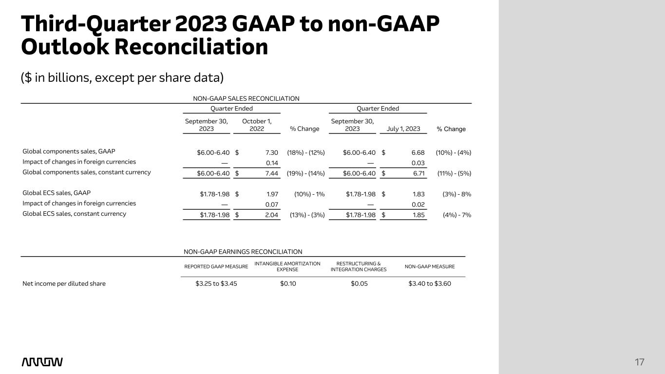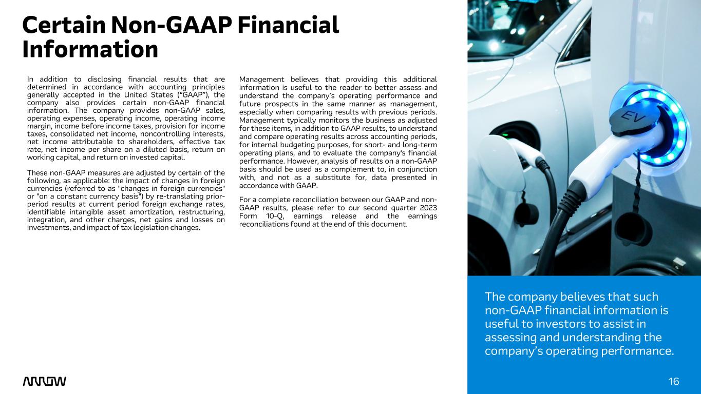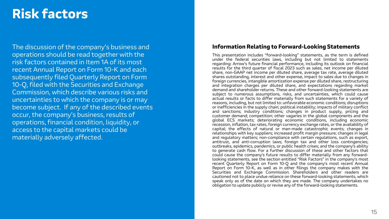 15 15 Risk factors The discussion of the company’s business and operations should be read together with the risk factors contained in Item 1A of its most recent Annual Report on Form 10-K and each subsequently filed Quarterly Report on Form 10-Q, filed with the Securities and Exchange Commission, which describe various risks and uncertainties to which the company is or may become subject. If any of the described events occur, the company’s business, results of operations, financial condition, liquidity, or access to the capital markets could be materially adversely affected. Information Relating to Forward-Looking Statements This presentation includes “forward-looking” statements, as the term is defined under the federal securities laws, including but not limited to statements regarding: Arrow’s future financial performance, including its outlook on financial results for the third quarter of fiscal 2023 such as sales, net income per diluted share, non-GAAP net income per diluted share, average tax rate, average diluted shares outstanding, interest and other expense, impact to sales due to changes in foreign currencies, intangible amortization expense per diluted share, restructuring and integration charges per diluted share, and expectations regarding market demand and shareholder returns. These and other forward-looking statements are subject to numerous assumptions, risks, and uncertainties, which could cause actual results or facts to differ materially from such statements for a variety of reasons, including, but not limited to: unfavorable economic conditions; disruptions or inefficiencies in the supply chain; political instability; impacts of military conflict and sanctions; industry conditions; changes in product supply, pricing and customer demand; competition; other vagaries in the global components and the global ECS markets; deteriorating economic conditions, including economic recession, inflation, tax rates, foreign currency exchange rates, or the availability of capital; the effects of natural or man-made catastrophic events; changes in relationships with key suppliers; increased profit margin pressure; changes in legal and regulatory matters; non-compliance with certain regulations, such as export, antitrust, and anti-corruption laws; foreign tax and other loss contingencies; outbreaks, epidemics, pandemics, or public health crises; and the company's ability to generate cash flow. For a further discussion of these and other factors that could cause the company's future results to differ materially from any forward- looking statements, see the section entitled “Risk Factors” in the company's most recent Quarterly Report on Form 10-Q and the company's most recent Annual Report on Form 10-K, as well as in other filings the company makes with the Securities and Exchange Commission. Shareholders and other readers are cautioned not to place undue reliance on these forward-looking statements, which speak only as of the date on which they are made. The company undertakes no obligation to update publicly or revise any of the forward-looking statements.