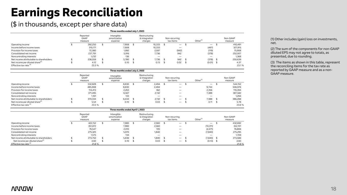 ($ in thousands, except per share data) Earnings Reconciliation (1) Other includes (gain) loss on investments, net. (2) The sum of the components for non-GAAP diluted EPS may not agree to totals, as presented, due to rounding. (3) The items as shown in this table, represent the reconciling items for the tax rate as reported by GAAP measure and as a non- GAAP measure. 18 Three months ended July 1, 2023 Reported GAAP measure Intangible amortization expense Restructuring & Integration charges Non-recurring tax items Other(1) Non-GAAP measure Operating income $ 392,250 $ 7,908 $ 10,333 $ — $ — $ 410,491 Income before income taxes 310,171 7,908 10,333 — (497) 327,915 Provision for income taxes 72,380 1,992 2,597 (942) (119) 75,908 Consolidated net income 237,791 5,916 7,736 942 (378) 252,007 Noncontrolling interests 1,232 136 — — — 1,368 Net income attributable to shareholders $ 236,559 $ 5,780 $ 7,736 $ 942 $ (378) $ 250,639 Net income per diluted share(2) $ 4.12 $ 0.10 $ 0.13 $ 0.02 $ (0.01) $ 4.37 Effective tax rate (3) 23.3 % 23.1 % Three months ended July 2, 2022 Reported GAAP measure Intangible amortization expense Restructuring & Integration charges Non-recurring tax items Other(1) Non-GAAP measure Operating income $ 532,828 $ 8,830 $ 2,494 $ — $ — $ 544,152 Income before income taxes 485,908 8,830 2,494 — 9,744 506,976 Provision for income taxes 114,413 2,263 362 — 2,356 119,394 Consolidated net income 371,495 6,567 2,132 — 7,388 387,582 Noncontrolling interests 1,161 133 — — — 1,294 Net income attributable to shareholders $ 370,334 $ 6,434 $ 2,132 $ — $ 7,388 $ 386,288 Net income per diluted share(2) $ 5.54 $ 0.10 $ 0.03 $ — $ 0.11 $ 5.78 Effective tax rate (3) 23.5 % 23.6 % Three months ended April 1, 2023 Reported GAAP measure Intangible amortization expense Restructuring & Integration charges Non-recurring tax items Other(1) Non-GAAP measure Operating income $ 422,152 $ 7,980 $ 2,560 $ — $ — $ 432,692 Income before income taxes 351,872 7,980 2,560 — (10,311) 352,101 Provision for income taxes 76,547 2,010 720 — (2,471) 76,806 Consolidated net income 275,325 5,970 1,840 — (7,840) 275,295 Noncontrolling interests 1,575 134 — — — 1,709 Net income attributable to shareholders $ 273,750 $ 5,836 $ 1,840 $ — $ (7,840) $ 273,586 Net income per diluted share(2) $ 4.60 $ 0.10 $ 0.03 $ — $ (0.13) $ 4.60 Effective tax rate (3) 21.8 % 21.8 %