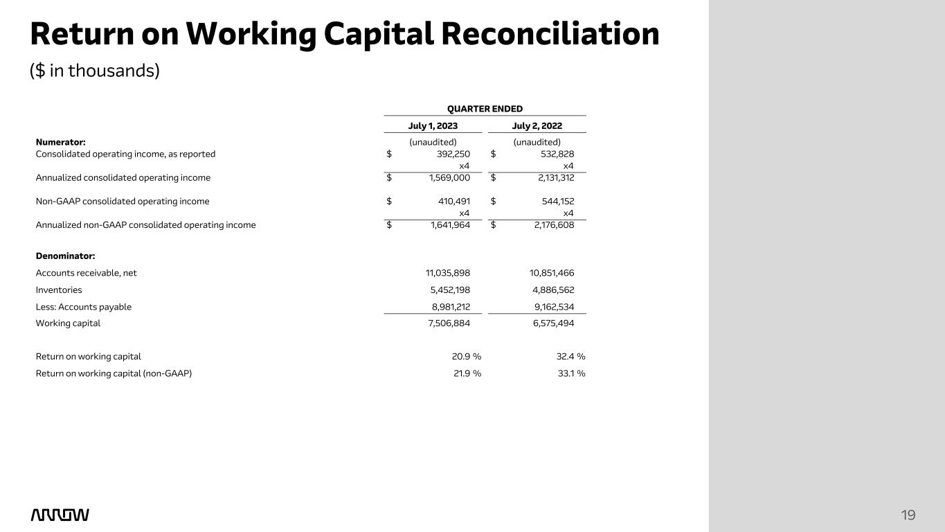 19 19 Return on Working Capital Reconciliation ($ in thousands) QUARTER ENDED July 1, 2023 July 2, 2022 Numerator: (unaudited) (unaudited) Consolidated operating income, as reported $ 392,250 $ 532,828 x4 x4 Annualized consolidated operating income $ 1,569,000 $ 2,131,312 Non-GAAP consolidated operating income $ 410,491 $ 544,152 x4 x4 Annualized non-GAAP consolidated operating income $ 1,641,964 $ 2,176,608 Denominator: Accounts receivable, net 11,035,898 10,851,466 Inventories 5,452,198 4,886,562 Less: Accounts payable 8,981,212 9,162,534 Working capital 7,506,884 6,575,494 Return on working capital 20.9 % 32.4 % Return on working capital (non-GAAP) 21.9 % 33.1 %