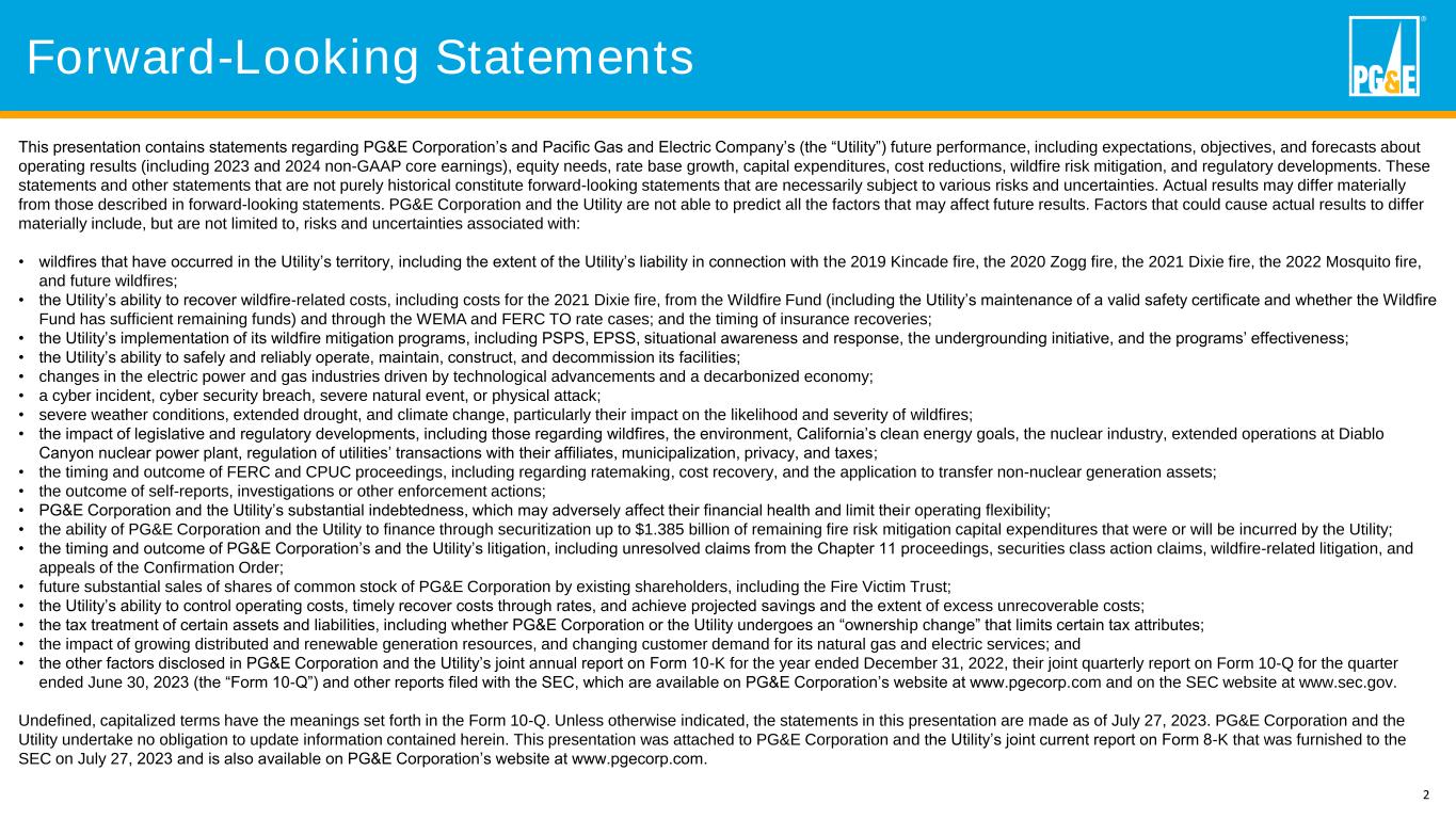 2 Forward-Looking Statements This presentation contains statements regarding PG&E Corporation’s and Pacific Gas and Electric Company’s (the “Utility”) future performance, including expectations, objectives, and forecasts about operating results (including 2023 and 2024 non-GAAP core earnings), equity needs, rate base growth, capital expenditures, cost reductions, wildfire risk mitigation, and regulatory developments. These statements and other statements that are not purely historical constitute forward-looking statements that are necessarily subject to various risks and uncertainties. Actual results may differ materially from those described in forward-looking statements. PG&E Corporation and the Utility are not able to predict all the factors that may affect future results. Factors that could cause actual results to differ materially include, but are not limited to, risks and uncertainties associated with: • wildfires that have occurred in the Utility’s territory, including the extent of the Utility’s liability in connection with the 2019 Kincade fire, the 2020 Zogg fire, the 2021 Dixie fire, the 2022 Mosquito fire, and future wildfires; • the Utility’s ability to recover wildfire-related costs, including costs for the 2021 Dixie fire, from the Wildfire Fund (including the Utility’s maintenance of a valid safety certificate and whether the Wildfire Fund has sufficient remaining funds) and through the WEMA and FERC TO rate cases; and the timing of insurance recoveries; • the Utility’s implementation of its wildfire mitigation programs, including PSPS, EPSS, situational awareness and response, the undergrounding initiative, and the programs’ effectiveness; • the Utility’s ability to safely and reliably operate, maintain, construct, and decommission its facilities; • changes in the electric power and gas industries driven by technological advancements and a decarbonized economy; • a cyber incident, cyber security breach, severe natural event, or physical attack; • severe weather conditions, extended drought, and climate change, particularly their impact on the likelihood and severity of wildfires; • the impact of legislative and regulatory developments, including those regarding wildfires, the environment, California’s clean energy goals, the nuclear industry, extended operations at Diablo Canyon nuclear power plant, regulation of utilities’ transactions with their affiliates, municipalization, privacy, and taxes; • the timing and outcome of FERC and CPUC proceedings, including regarding ratemaking, cost recovery, and the application to transfer non-nuclear generation assets; • the outcome of self-reports, investigations or other enforcement actions; • PG&E Corporation and the Utility’s substantial indebtedness, which may adversely affect their financial health and limit their operating flexibility; • the ability of PG&E Corporation and the Utility to finance through securitization up to $1.385 billion of remaining fire risk mitigation capital expenditures that were or will be incurred by the Utility; • the timing and outcome of PG&E Corporation’s and the Utility’s litigation, including unresolved claims from the Chapter 11 proceedings, securities class action claims, wildfire-related litigation, and appeals of the Confirmation Order; • future substantial sales of shares of common stock of PG&E Corporation by existing shareholders, including the Fire Victim Trust; • the Utility’s ability to control operating costs, timely recover costs through rates, and achieve projected savings and the extent of excess unrecoverable costs; • the tax treatment of certain assets and liabilities, including whether PG&E Corporation or the Utility undergoes an “ownership change” that limits certain tax attributes; • the impact of growing distributed and renewable generation resources, and changing customer demand for its natural gas and electric services; and • the other factors disclosed in PG&E Corporation and the Utility’s joint annual report on Form 10-K for the year ended December 31, 2022, their joint quarterly report on Form 10-Q for the quarter ended June 30, 2023 (the “Form 10-Q”) and other reports filed with the SEC, which are available on PG&E Corporation’s website at www.pgecorp.com and on the SEC website at www.sec.gov. Undefined, capitalized terms have the meanings set forth in the Form 10-Q. Unless otherwise indicated, the statements in this presentation are made as of July 27, 2023. PG&E Corporation and the Utility undertake no obligation to update information contained herein. This presentation was attached to PG&E Corporation and the Utility’s joint current report on Form 8-K that was furnished to the SEC on July 27, 2023 and is also available on PG&E Corporation’s website at www.pgecorp.com.