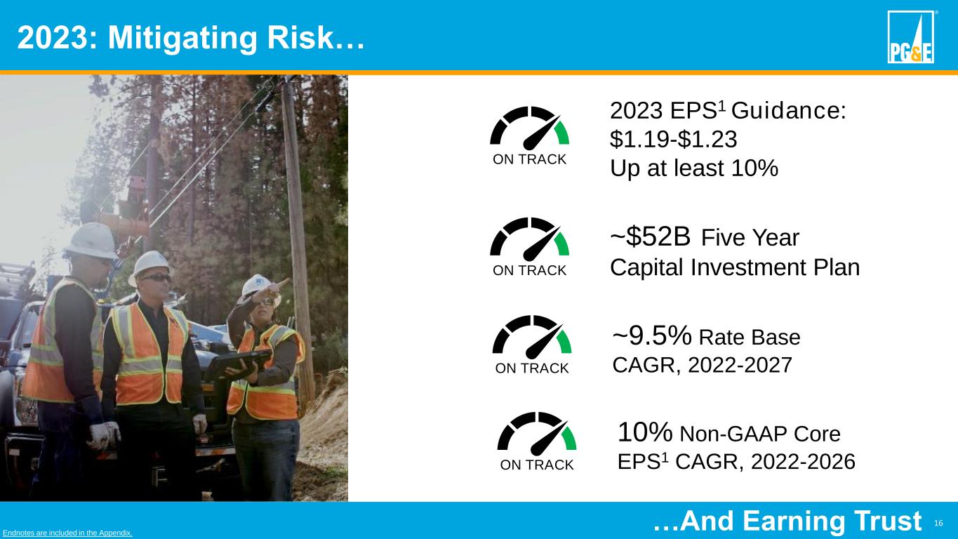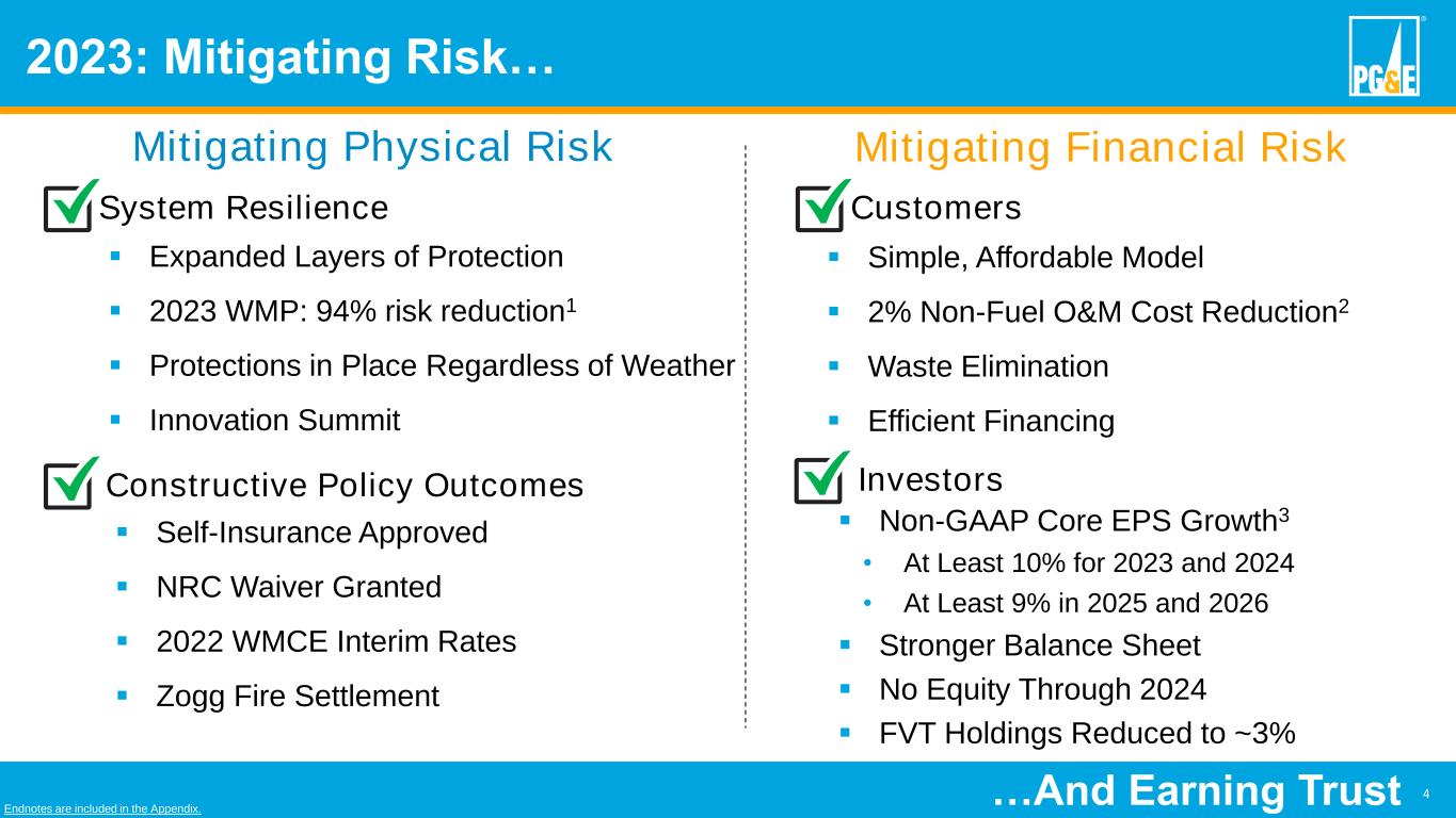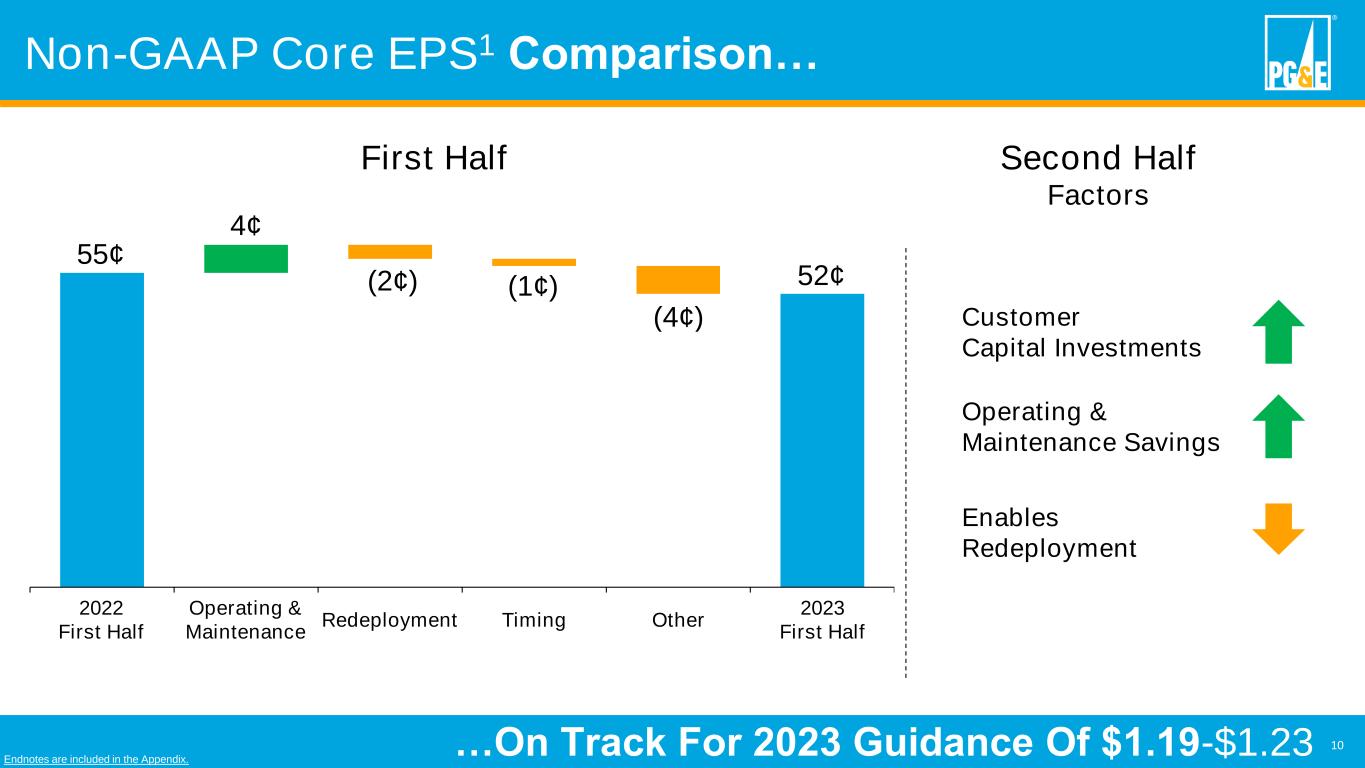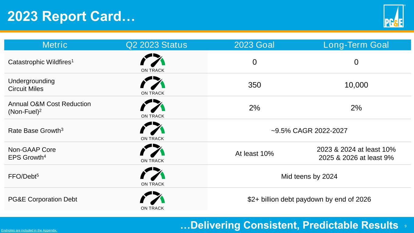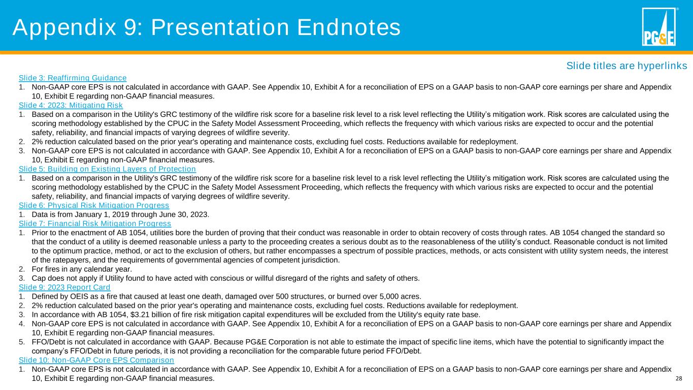 28 Slide titles are hyperlinks Slide 3: Reaffirming Guidance 1. Non-GAAP core EPS is not calculated in accordance with GAAP. See Appendix 10, Exhibit A for a reconciliation of EPS on a GAAP basis to non-GAAP core earnings per share and Appendix 10, Exhibit E regarding non-GAAP financial measures. Slide 4: 2023: Mitigating Risk 1. Based on a comparison in the Utility's GRC testimony of the wildfire risk score for a baseline risk level to a risk level reflecting the Utility’s mitigation work. Risk scores are calculated using the scoring methodology established by the CPUC in the Safety Model Assessment Proceeding, which reflects the frequency with which various risks are expected to occur and the potential safety, reliability, and financial impacts of varying degrees of wildfire severity. 2. 2% reduction calculated based on the prior year's operating and maintenance costs, excluding fuel costs. Reductions available for redeployment. 3. Non-GAAP core EPS is not calculated in accordance with GAAP. See Appendix 10, Exhibit A for a reconciliation of EPS on a GAAP basis to non-GAAP core earnings per share and Appendix 10, Exhibit E regarding non-GAAP financial measures. Slide 5: Building on Existing Layers of Protection 1. Based on a comparison in the Utility's GRC testimony of the wildfire risk score for a baseline risk level to a risk level reflecting the Utility’s mitigation work. Risk scores are calculated using the scoring methodology established by the CPUC in the Safety Model Assessment Proceeding, which reflects the frequency with which various risks are expected to occur and the potential safety, reliability, and financial impacts of varying degrees of wildfire severity. Slide 6: Physical Risk Mitigation Progress 1. Data is from January 1, 2019 through June 30, 2023. Slide 7: Financial Risk Mitigation Progress 1. Prior to the enactment of AB 1054, utilities bore the burden of proving that their conduct was reasonable in order to obtain recovery of costs through rates. AB 1054 changed the standard so that the conduct of a utility is deemed reasonable unless a party to the proceeding creates a serious doubt as to the reasonableness of the utility’s conduct. Reasonable conduct is not limited to the optimum practice, method, or act to the exclusion of others, but rather encompasses a spectrum of possible practices, methods, or acts consistent with utility system needs, the interest of the ratepayers, and the requirements of governmental agencies of competent jurisdiction. 2. For fires in any calendar year. 3. Cap does not apply if Utility found to have acted with conscious or willful disregard of the rights and safety of others. Slide 9: 2023 Report Card 1. Defined by OEIS as a fire that caused at least one death, damaged over 500 structures, or burned over 5,000 acres. 2. 2% reduction calculated based on the prior year's operating and maintenance costs, excluding fuel costs. Reductions available for redeployment. 3. In accordance with AB 1054, $3.21 billion of fire risk mitigation capital expenditures will be excluded from the Utility's equity rate base. 4. Non-GAAP core EPS is not calculated in accordance with GAAP. See Appendix 10, Exhibit A for a reconciliation of EPS on a GAAP basis to non-GAAP core earnings per share and Appendix 10, Exhibit E regarding non-GAAP financial measures. 5. FFO/Debt is not calculated in accordance with GAAP. Because PG&E Corporation is not able to estimate the impact of specific line items, which have the potential to significantly impact the company’s FFO/Debt in future periods, it is not providing a reconciliation for the comparable future period FFO/Debt. Slide 10: Non-GAAP Core EPS Comparison 1. Non-GAAP core EPS is not calculated in accordance with GAAP. See Appendix 10, Exhibit A for a reconciliation of EPS on a GAAP basis to non-GAAP core earnings per share and Appendix 10, Exhibit E regarding non-GAAP financial measures. Appendix 9: Presentation Endnotes
