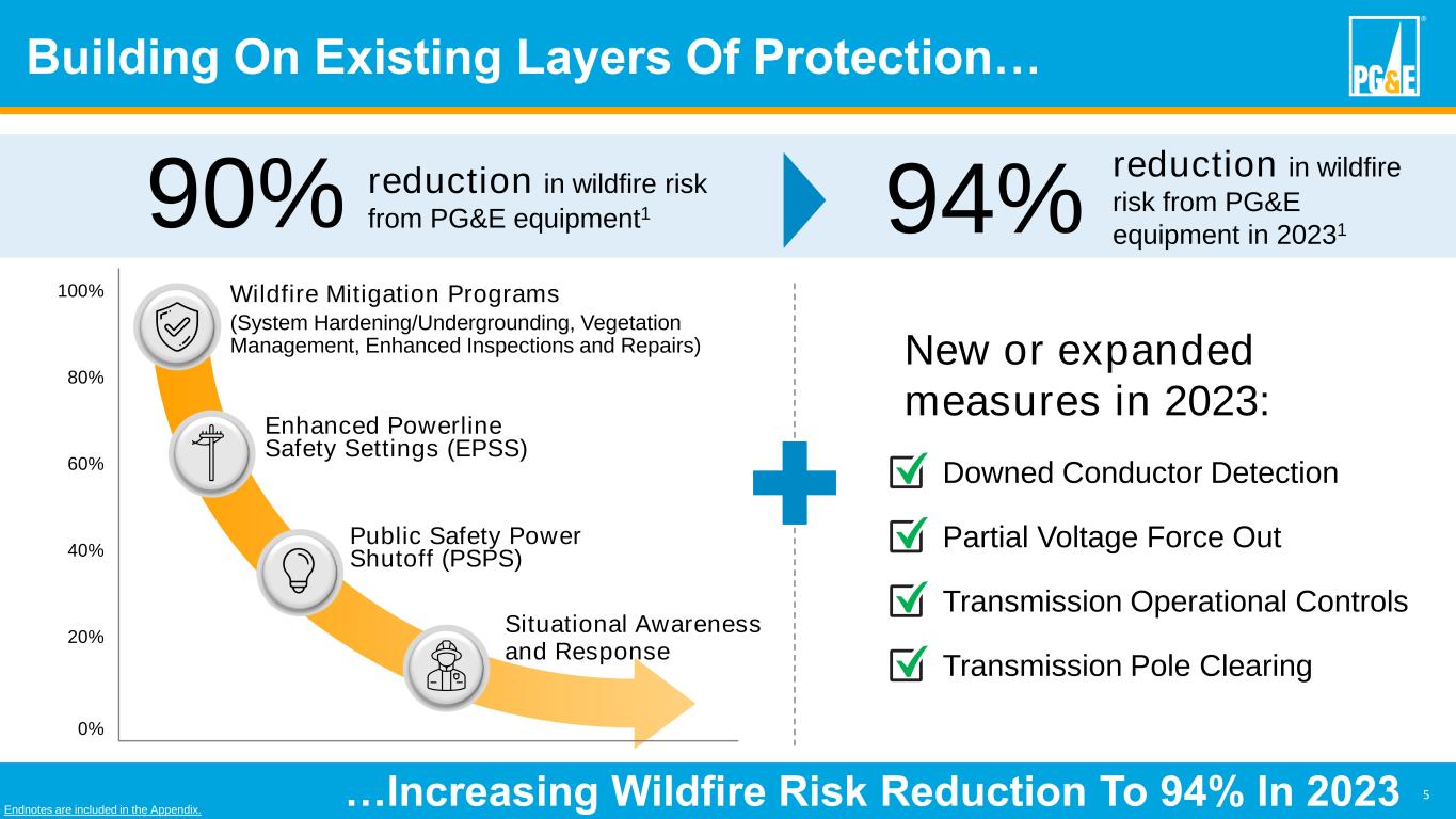 4 Endnotes are included in the Appendix. 2023: Mitigating Risk… …And Earning Trust Mitigating Financial RiskMitigating Physical Risk ▪ Simple, Affordable Model ▪ 2% Non-Fuel O&M Cost Reduction2 ▪ Waste Elimination ▪ Efficient Financing Customers ▪ Expanded Layers of Protection ▪ 2023 WMP: 94% risk reduction1 ▪ Protections in Place Regardless of Weather ▪ Innovation Summit System Resilience ▪ Self-Insurance Approved ▪ NRC Waiver Granted ▪ 2022 WMCE Interim Rates ▪ Zogg Fire Settlement Constructive Policy Outcomes ▪ Non-GAAP Core EPS Growth3 • At Least 10% for 2023 and 2024 • At Least 9% in 2025 and 2026 ▪ Stronger Balance Sheet ▪ No Equity Through 2024 ▪ FVT Holdings Reduced to ~3% Investors