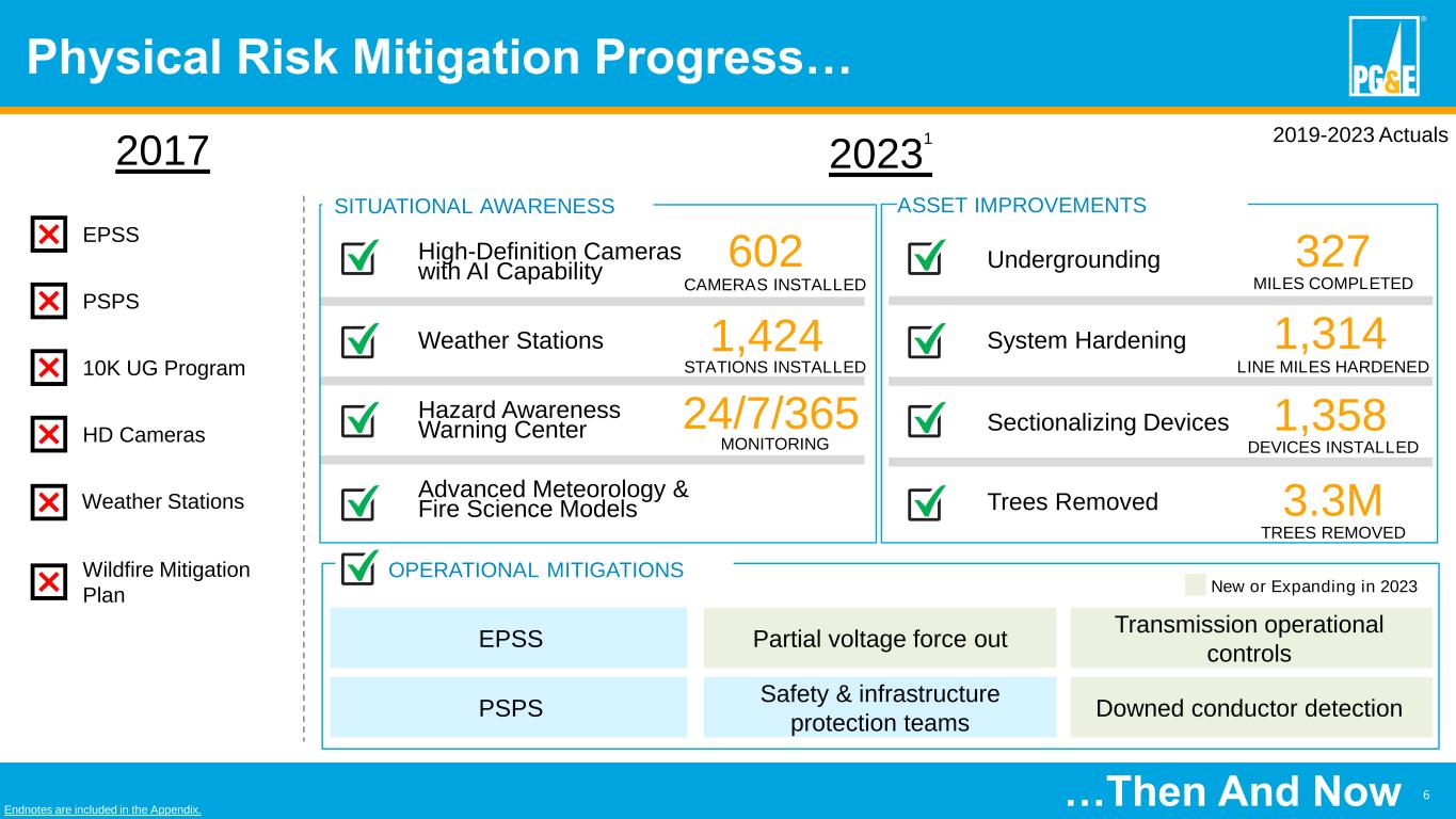 5 Endnotes are included in the Appendix. Building On Existing Layers Of Protection… …Increasing Wildfire Risk Reduction To 94% In 2023 reduction in wildfire risk from PG&E equipment1 90% 94% reduction in wildfire risk from PG&E equipment in 20231 100% 80% 60% 40% 20% 0% Wildfire Mitigation Programs (System Hardening/Undergrounding, Vegetation Management, Enhanced Inspections and Repairs) Enhanced Powerline Safety Settings (EPSS) Situational Awareness and Response Public Safety Power Shutoff (PSPS) Downed Conductor Detection Partial Voltage Force Out Transmission Operational Controls Transmission Pole Clearing New or expanded measures in 2023: