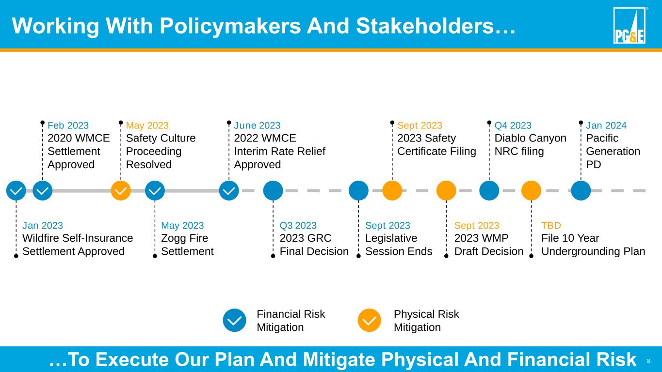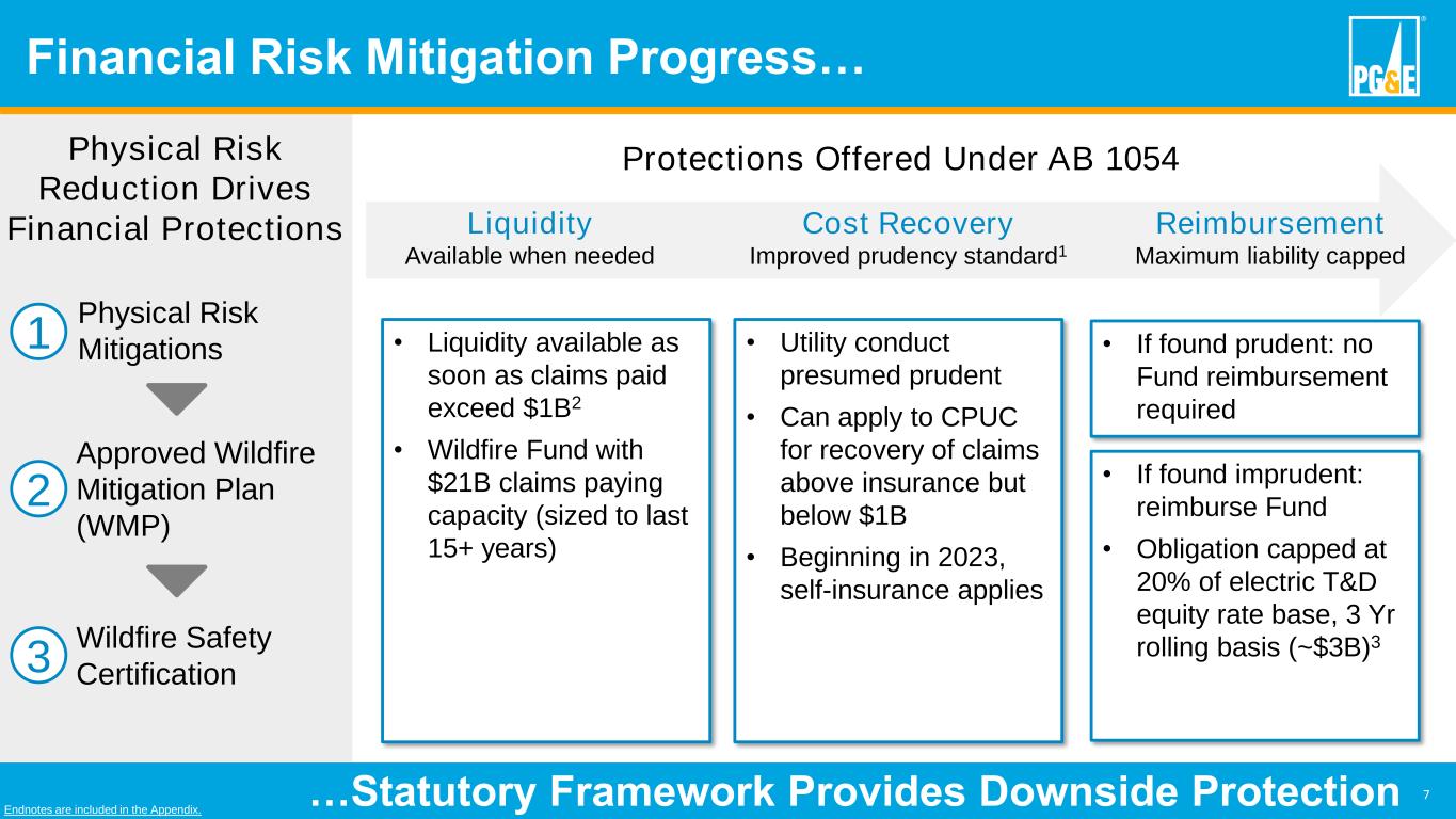 7 Endnotes are included in the Appendix. Protections Offered Under AB 1054 Financial Risk Mitigation Progress… …Statutory Framework Provides Downside Protection Physical Risk Reduction Drives Financial Protections • Liquidity available as soon as claims paid exceed $1B2 • Wildfire Fund with $21B claims paying capacity (sized to last 15+ years) Liquidity Available when needed Cost Recovery Improved prudency standard1 Reimbursement Maximum liability capped • Utility conduct presumed prudent • Can apply to CPUC for recovery of claims above insurance but below $1B • Beginning in 2023, self-insurance applies • If found imprudent: reimburse Fund • Obligation capped at 20% of electric T&D equity rate base, 3 Yr rolling basis (~$3B)3 • If found prudent: no Fund reimbursement required Physical Risk Mitigations1 Approved Wildfire Mitigation Plan (WMP) 2 Wildfire Safety Certification3