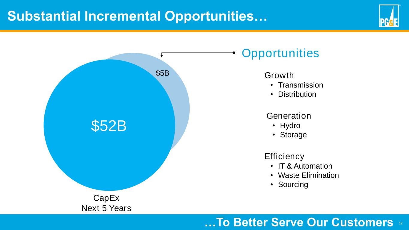 12 $5B Substantial Incremental Opportunities… …To Better Serve Our Customers CapEx Next 5 Years $52B Opportunities Growth • Transmission • Distribution Generation • Hydro • Storage Efficiency • IT & Automation • Waste Elimination • Sourcing