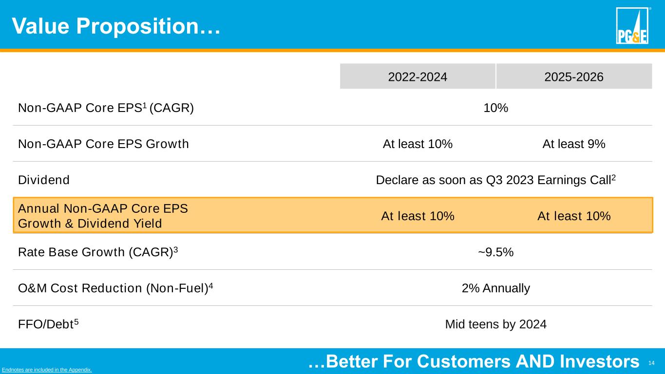 13 Endnotes are included in the Appendix. Simple, Affordable Model… …Creates Room For Customer Capital Investment Examples of O&M Cost Reductions (Non-Fuel) Efficient Financing Sale of Minority Interest in Pac Gen/DOE Low-Cost Loan Program 2022 Actual 2023 Plan Long-Term Plan Good Business Decision (millions) (millions) (millions) - Attrition $ 25 $ 25 $ 25 - Efficiencies & Insurance 270 200 50 - Capital Conversion 100 50 25 - Automation 5 15 30 Savings Through Lean - Planning & Execution Improvements 45 100 150 Net Cost Increases (115) (190) (80) Net Savings $ 330 $ 200 $ 200 Percent Savings (Fast Start) 3% 2% 2% MODEL1 OPPORTUNITIES Customer Capital Investment ~9% Offsets -O&M cost reduction (non-fuel)2 2% -Electric load growth3 1% - 3% -Other (including efficient financing)4 2% Subtotal 5% - 7% Customer Impacts: At or Below Assumed Inflation 2% - 4% 2