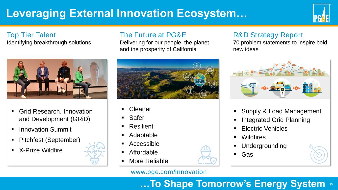 15 Leveraging External Innovation Ecosystem… …To Shape Tomorrow’s Energy System www.pge.com/innovation Top Tier Talent Identifying breakthrough solutions The Future at PG&E Delivering for our people, the planet and the prosperity of California R&D Strategy Report 70 problem statements to inspire bold new ideas ▪ Supply & Load Management ▪ Integrated Grid Planning ▪ Electric Vehicles ▪ Wildfires ▪ Undergrounding ▪ Gas ▪ Grid Research, Innovation and Development (GRiD) ▪ Innovation Summit ▪ Pitchfest (September) ▪ X-Prize Wildfire ▪ Cleaner ▪ Safer ▪ Resilient ▪ Adaptable ▪ Accessible ▪ Affordable ▪ More Reliable