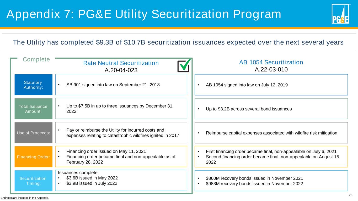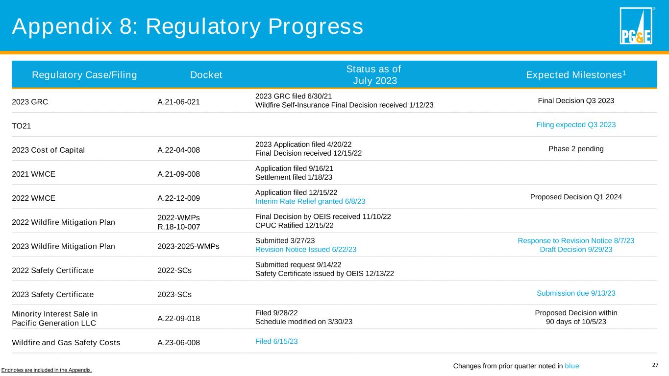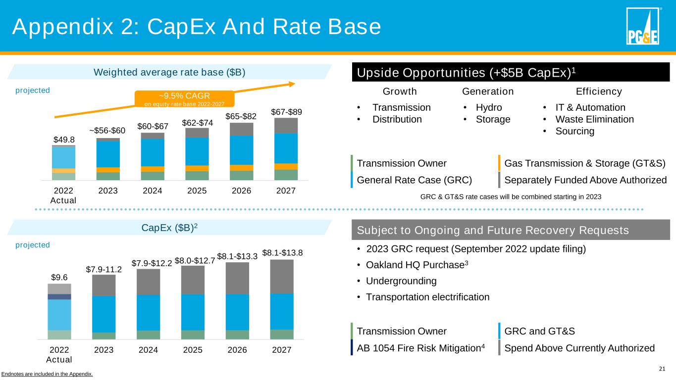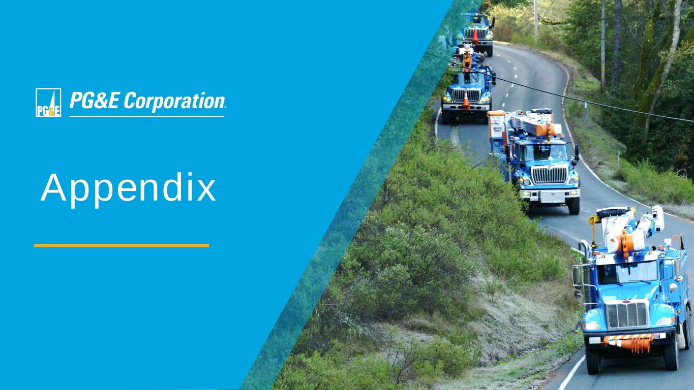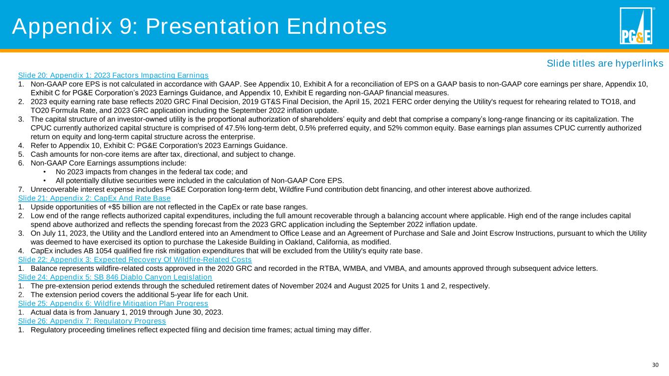 30 Slide titles are hyperlinks Appendix 9: Presentation Endnotes Slide 20: Appendix 1: 2023 Factors Impacting Earnings 1. Non-GAAP core EPS is not calculated in accordance with GAAP. See Appendix 10, Exhibit A for a reconciliation of EPS on a GAAP basis to non-GAAP core earnings per share, Appendix 10, Exhibit C for PG&E Corporation’s 2023 Earnings Guidance, and Appendix 10, Exhibit E regarding non-GAAP financial measures. 2. 2023 equity earning rate base reflects 2020 GRC Final Decision, 2019 GT&S Final Decision, the April 15, 2021 FERC order denying the Utility's request for rehearing related to TO18, and TO20 Formula Rate, and 2023 GRC application including the September 2022 inflation update. 3. The capital structure of an investor-owned utility is the proportional authorization of shareholders’ equity and debt that comprise a company’s long-range financing or its capitalization. The CPUC currently authorized capital structure is comprised of 47.5% long-term debt, 0.5% preferred equity, and 52% common equity. Base earnings plan assumes CPUC currently authorized return on equity and long-term capital structure across the enterprise. 4. Refer to Appendix 10, Exhibit C: PG&E Corporation's 2023 Earnings Guidance. 5. Cash amounts for non-core items are after tax, directional, and subject to change. 6. Non-GAAP Core Earnings assumptions include: • No 2023 impacts from changes in the federal tax code; and • All potentially dilutive securities were included in the calculation of Non-GAAP Core EPS. 7. Unrecoverable interest expense includes PG&E Corporation long-term debt, Wildfire Fund contribution debt financing, and other interest above authorized. Slide 21: Appendix 2: CapEx And Rate Base 1. Upside opportunities of +$5 billion are not reflected in the CapEx or rate base ranges. 2. Low end of the range reflects authorized capital expenditures, including the full amount recoverable through a balancing account where applicable. High end of the range includes capital spend above authorized and reflects the spending forecast from the 2023 GRC application including the September 2022 inflation update. 3. On July 11, 2023, the Utility and the Landlord entered into an Amendment to Office Lease and an Agreement of Purchase and Sale and Joint Escrow Instructions, pursuant to which the Utility was deemed to have exercised its option to purchase the Lakeside Building in Oakland, California, as modified. 4. CapEx includes AB 1054 qualified fire risk mitigation expenditures that will be excluded from the Utility's equity rate base. Slide 22: Appendix 3: Expected Recovery Of Wildfire-Related Costs 1. Balance represents wildfire-related costs approved in the 2020 GRC and recorded in the RTBA, WMBA, and VMBA, and amounts approved through subsequent advice letters. Slide 24: Appendix 5: SB 846 Diablo Canyon Legislation 1. The pre-extension period extends through the scheduled retirement dates of November 2024 and August 2025 for Units 1 and 2, respectively. 2. The extension period covers the additional 5-year life for each Unit. Slide 25: Appendix 6: Wildfire Mitigation Plan Progress 1. Actual data is from January 1, 2019 through June 30, 2023. Slide 26: Appendix 7: Regulatory Progress 1. Regulatory proceeding timelines reflect expected filing and decision time frames; actual timing may differ.
