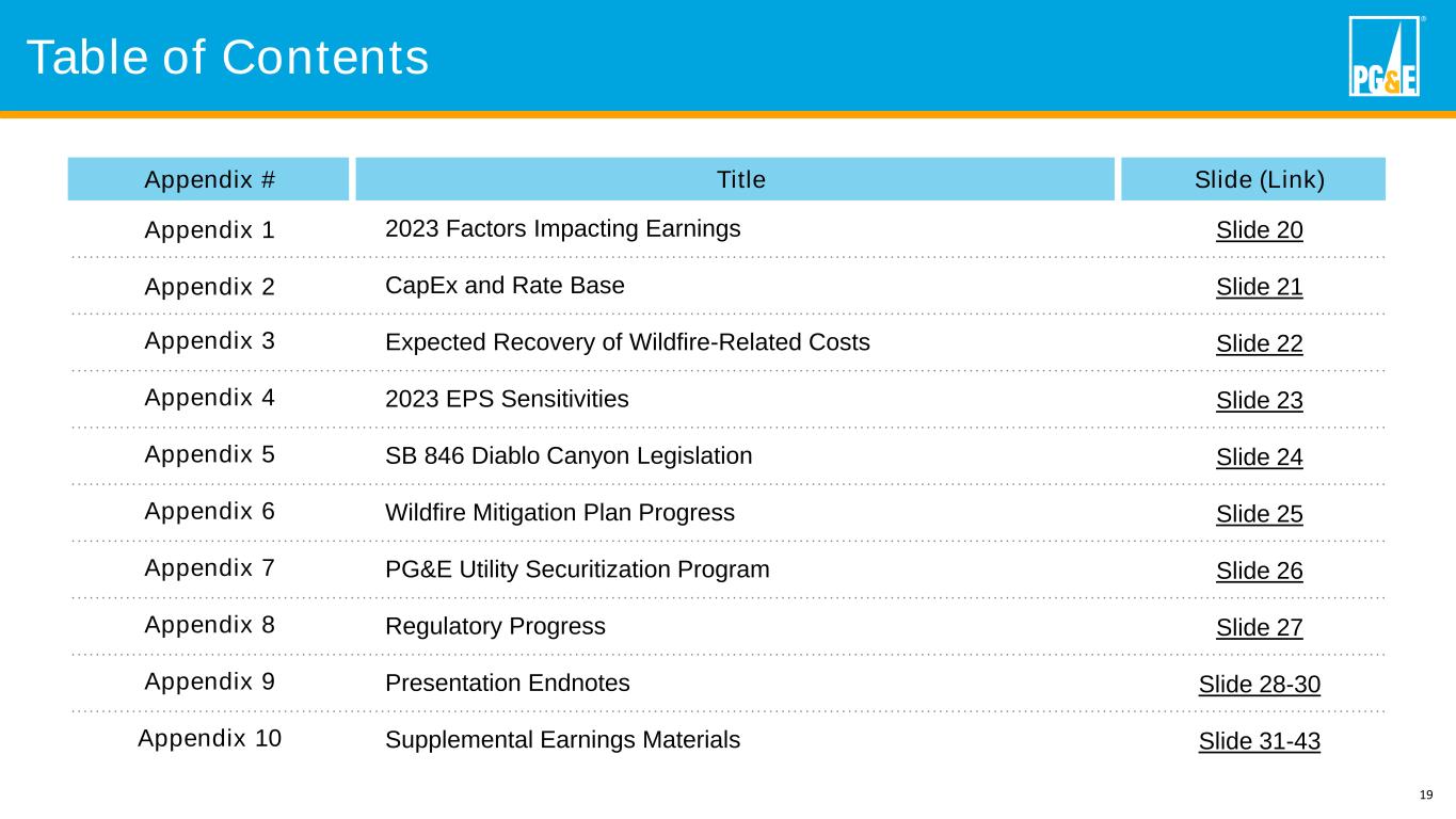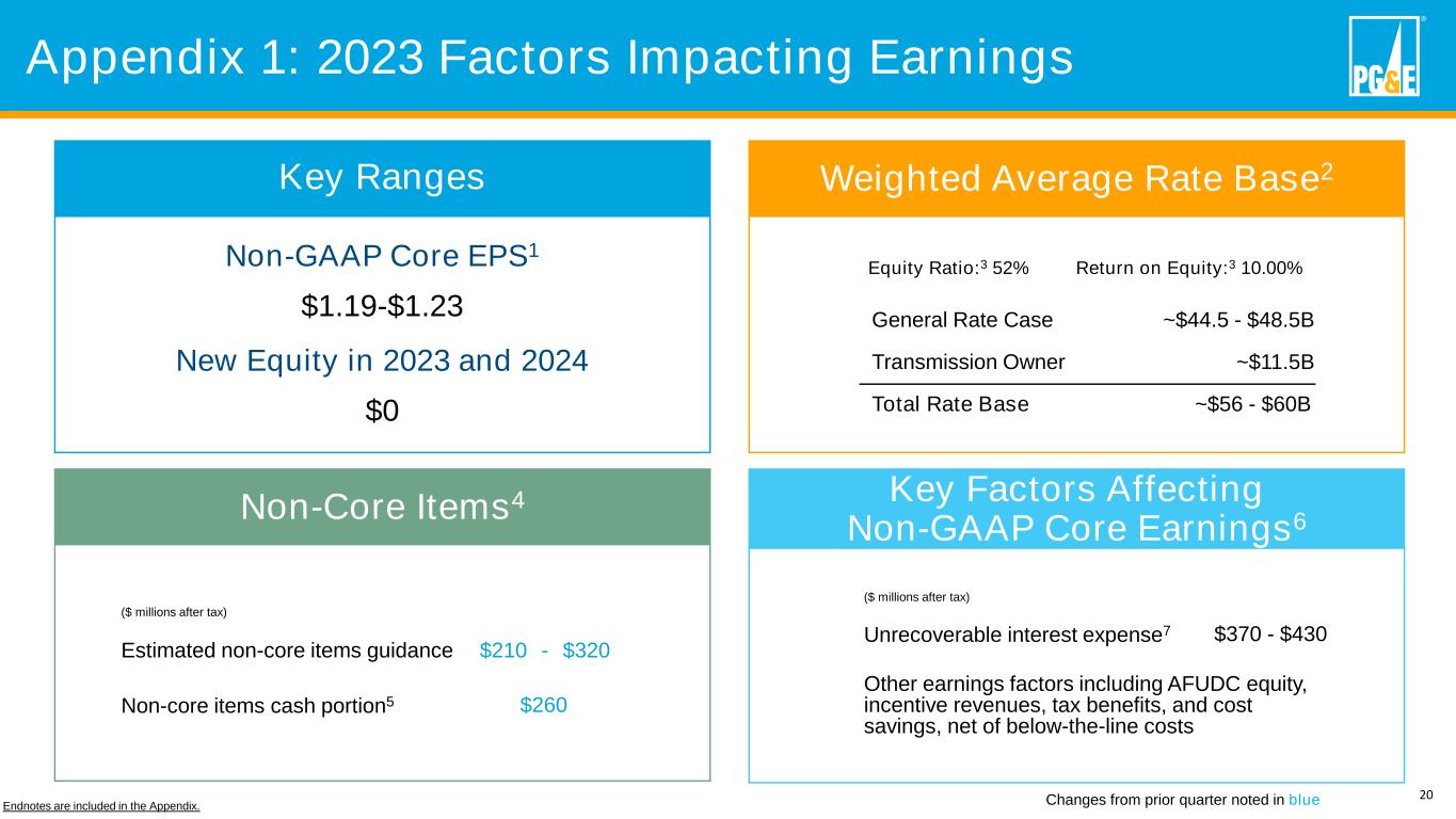 19 Table of Contents Appendix # Title Slide (Link) Appendix 1 2023 Factors Impacting Earnings Slide 20 Appendix 2 CapEx and Rate Base Slide 21 Appendix 3 Expected Recovery of Wildfire-Related Costs Slide 22 Appendix 4 2023 EPS Sensitivities Slide 23 Appendix 5 SB 846 Diablo Canyon Legislation Slide 24 Appendix 6 Wildfire Mitigation Plan Progress Slide 25 Appendix 7 PG&E Utility Securitization Program Slide 26 Appendix 8 Regulatory Progress Slide 27 Appendix 9 Presentation Endnotes Slide 28-30 Appendix 10 Supplemental Earnings Materials Slide 31-43