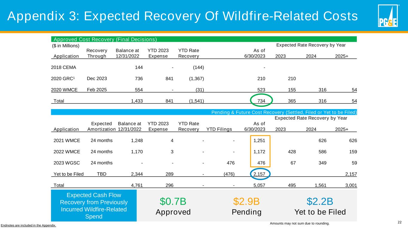 22 Endnotes are included in the Appendix. Appendix 3: Expected Recovery Of Wildfire-Related Costs Amounts may not sum due to rounding. Expected Cash Flow Recovery from Previously Incurred Wildfire-Related Spend $0.7B Approved $2.9B Pending $2.2B Yet to be Filed Approved Cost Recovery (Final Decisions) Expected Rate Recovery by Year Application Recovery Through Balance at 12/31/2022 YTD 2023 Expense YTD Rate Recovery As of 6/30/2023 2023 2024 2025+ 2018 CEMA 144 - (144) - 2020 GRC1 Dec 2023 736 841 (1,367) 210 210 2020 WMCE Feb 2025 554 - (31) 523 155 316 54 Total 1,433 841 (1,541) 734 365 316 54 Pending & Future Cost Recovery (Settled, Filed or Yet to be Filed) Expected Rate Recovery by Year Application Expected Amortization Balance at 12/31/2022 YTD 2023 Expense YTD Rate Recovery YTD Filings As of 6/30/2023 2023 2024 2025+ 2021 WMCE 24 months 1,248 4 - - 1,251 626 626 2022 WMCE 24 months 1,170 3 - - 1,172 428 586 159 2023 WGSC 24 months - - - 476 476 67 349 59 Yet to be Filed TBD 2,344 289 - (476) 2,157 2,157 Total 4,761 296 - - 5,057 495 1,561 3,001 ($ in Millions)