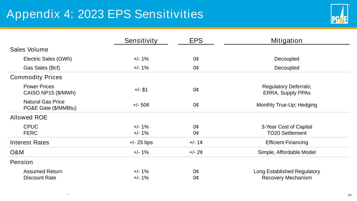 23 Sensitivity EPS Mitigation Sales Volume Electric Sales (GWh) +/- 1% 0¢ Decoupled Gas Sales (Bcf) +/- 1% 0¢ Decoupled Commodity Prices Power Prices CAISO NP15 ($/MWh) +/- $1 0¢ Regulatory Deferrals; ERRA, Supply PPAs Natural Gas Price PG&E Gate ($/MMBtu) +/- 50¢ 0¢ Monthly True-Up; Hedging Allowed ROE CPUC FERC +/- 1% +/- 1% 0¢ 0¢ 3-Year Cost of Capital TO20 Settlement Interest Rates +/- 25 bps +/- 1¢ Efficient Financing O&M +/- 1% +/- 2¢ Simple, Affordable Model Pension Assumed Return Discount Rate +/- 1% +/- 1% 0¢ 0¢ Long Established Regulatory Recovery Mechanism Appendix 4: 2023 EPS Sensitivities