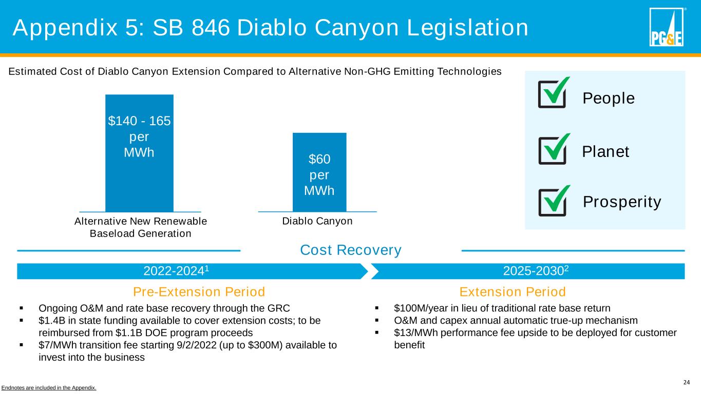 24 Endnotes are included in the Appendix. $140 - 165 per MWh Alternative New Renewable Baseload Generation $60 per MWh Diablo Canyon Cost Recovery People Planet Prosperity 2022-20241 2025-20302 ▪ Ongoing O&M and rate base recovery through the GRC ▪ $1.4B in state funding available to cover extension costs; to be reimbursed from $1.1B DOE program proceeds ▪ $7/MWh transition fee starting 9/2/2022 (up to $300M) available to invest into the business ▪ $100M/year in lieu of traditional rate base return ▪ O&M and capex annual automatic true-up mechanism ▪ $13/MWh performance fee upside to be deployed for customer benefit Pre-Extension Period Extension Period Estimated Cost of Diablo Canyon Extension Compared to Alternative Non-GHG Emitting Technologies Appendix 5: SB 846 Diablo Canyon Legislation