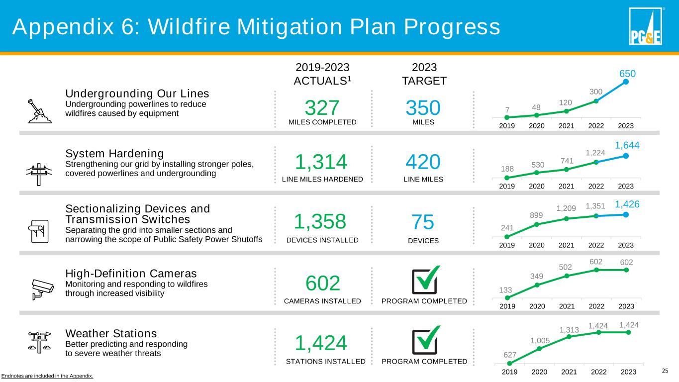 25 Endnotes are included in the Appendix. Appendix 6: Wildfire Mitigation Plan Progress Undergrounding Our Lines Undergrounding powerlines to reduce wildfires caused by equipment System Hardening Strengthening our grid by installing stronger poles, covered powerlines and undergrounding Sectionalizing Devices and Transmission Switches Separating the grid into smaller sections and narrowing the scope of Public Safety Power Shutoffs High-Definition Cameras Monitoring and responding to wildfires through increased visibility Weather Stations Better predicting and responding to severe weather threats 2019 2020 2021 2022 2023 7 48 120 300 650 2019 2020 2021 2022 2023 188 530 741 1,224 1,644 2019 2020 2021 2022 2023 241 899 1,209 1,351 1,426 2019 2020 2021 2022 2023 133 349 502 602 602 2019 2020 2021 2022 2023 627 1,005 1,313 1,424 1,424 2019-2023 ACTUALS1 STATIONS INSTALLED 1,424 CAMERAS INSTALLED 602 DEVICES INSTALLED 1,358 LINE MILES HARDENED 1,314 MILES COMPLETED 327 2023 TARGET DEVICES 75 MILES 350 LINE MILES 420 PROGRAM COMPLETED PROGRAM COMPLETED