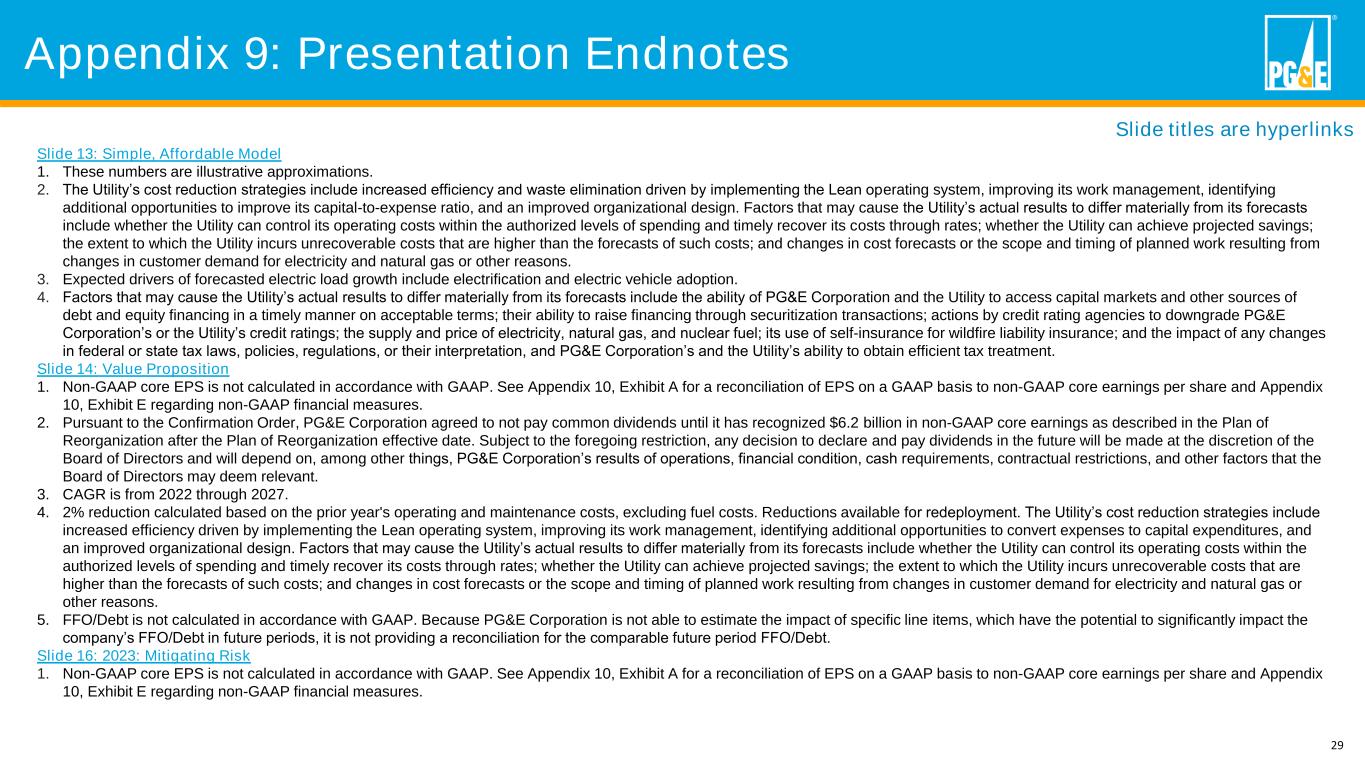 29 Slide titles are hyperlinks Slide 13: Simple, Affordable Model 1. These numbers are illustrative approximations. 2. The Utility’s cost reduction strategies include increased efficiency and waste elimination driven by implementing the Lean operating system, improving its work management, identifying additional opportunities to improve its capital-to-expense ratio, and an improved organizational design. Factors that may cause the Utility’s actual results to differ materially from its forecasts include whether the Utility can control its operating costs within the authorized levels of spending and timely recover its costs through rates; whether the Utility can achieve projected savings; the extent to which the Utility incurs unrecoverable costs that are higher than the forecasts of such costs; and changes in cost forecasts or the scope and timing of planned work resulting from changes in customer demand for electricity and natural gas or other reasons. 3. Expected drivers of forecasted electric load growth include electrification and electric vehicle adoption. 4. Factors that may cause the Utility’s actual results to differ materially from its forecasts include the ability of PG&E Corporation and the Utility to access capital markets and other sources of debt and equity financing in a timely manner on acceptable terms; their ability to raise financing through securitization transactions; actions by credit rating agencies to downgrade PG&E Corporation’s or the Utility’s credit ratings; the supply and price of electricity, natural gas, and nuclear fuel; its use of self-insurance for wildfire liability insurance; and the impact of any changes in federal or state tax laws, policies, regulations, or their interpretation, and PG&E Corporation’s and the Utility’s ability to obtain efficient tax treatment. Slide 14: Value Proposition 1. Non-GAAP core EPS is not calculated in accordance with GAAP. See Appendix 10, Exhibit A for a reconciliation of EPS on a GAAP basis to non-GAAP core earnings per share and Appendix 10, Exhibit E regarding non-GAAP financial measures. 2. Pursuant to the Confirmation Order, PG&E Corporation agreed to not pay common dividends until it has recognized $6.2 billion in non-GAAP core earnings as described in the Plan of Reorganization after the Plan of Reorganization effective date. Subject to the foregoing restriction, any decision to declare and pay dividends in the future will be made at the discretion of the Board of Directors and will depend on, among other things, PG&E Corporation’s results of operations, financial condition, cash requirements, contractual restrictions, and other factors that the Board of Directors may deem relevant. 3. CAGR is from 2022 through 2027. 4. 2% reduction calculated based on the prior year's operating and maintenance costs, excluding fuel costs. Reductions available for redeployment. The Utility’s cost reduction strategies include increased efficiency driven by implementing the Lean operating system, improving its work management, identifying additional opportunities to convert expenses to capital expenditures, and an improved organizational design. Factors that may cause the Utility’s actual results to differ materially from its forecasts include whether the Utility can control its operating costs within the authorized levels of spending and timely recover its costs through rates; whether the Utility can achieve projected savings; the extent to which the Utility incurs unrecoverable costs that are higher than the forecasts of such costs; and changes in cost forecasts or the scope and timing of planned work resulting from changes in customer demand for electricity and natural gas or other reasons. 5. FFO/Debt is not calculated in accordance with GAAP. Because PG&E Corporation is not able to estimate the impact of specific line items, which have the potential to significantly impact the company’s FFO/Debt in future periods, it is not providing a reconciliation for the comparable future period FFO/Debt. Slide 16: 2023: Mitigating Risk 1. Non-GAAP core EPS is not calculated in accordance with GAAP. See Appendix 10, Exhibit A for a reconciliation of EPS on a GAAP basis to non-GAAP core earnings per share and Appendix 10, Exhibit E regarding non-GAAP financial measures. Appendix 9: Presentation Endnotes
