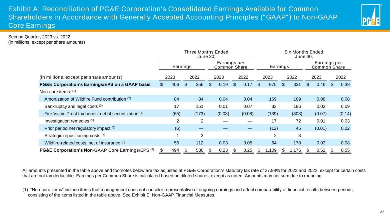 32 Exhibit A: Reconciliation of PG&E Corporation's Consolidated Earnings Available for Common Shareholders in Accordance with Generally Accepted Accounting Principles ("GAAP") to Non-GAAP Core Earnings Three Months Ended June 30, Six Months Ended June 30, Earnings Earnings per Common Share Earnings Earnings per Common Share (in millions, except per share amounts) 2023 2022 2023 2022 2023 2022 2023 2022 PG&E Corporation’s Earnings/EPS on a GAAP basis $ 406 $ 356 $ 0.19 $ 0.17 $ 975 $ 831 $ 0.46 $ 0.39 Non-core items: (1) Amortization of Wildfire Fund contribution (2) 84 84 0.04 0.04 169 169 0.08 0.08 Bankruptcy and legal costs (3) 17 151 0.01 0.07 33 186 0.02 0.09 Fire Victim Trust tax benefit net of securitization (4) (65) (173) (0.03) (0.08) (139) (308) (0.07) (0.14) Investigation remedies (5) 2 2 — — 17 72 0.01 0.03 Prior period net regulatory impact (6) (6) — — — (12) 45 (0.01) 0.02 Strategic repositioning costs (7) 1 3 — — 2 3 — — Wildfire-related costs, net of insurance (8) 55 112 0.03 0.05 64 178 0.03 0.08 PG&E Corporation’s Non-GAAP Core Earnings/EPS (9) $ 494 $ 536 $ 0.23 $ 0.25 $ 1,109 $ 1,175 $ 0.52 $ 0.55 All amounts presented in the table above and footnotes below are tax adjusted at PG&E Corporation’s statutory tax rate of 27.98% for 2023 and 2022, except for certain costs that are not tax deductible. Earnings per Common Share is calculated based on diluted shares, except as noted. Amounts may not sum due to rounding. Second Quarter, 2023 vs. 2022 (in millions, except per share amounts) (1) “Non-core items” include items that management does not consider representative of ongoing earnings and affect comparability of financial results between periods, consisting of the items listed in the table above. See Exhibit E: Non-GAAP Financial Measures.