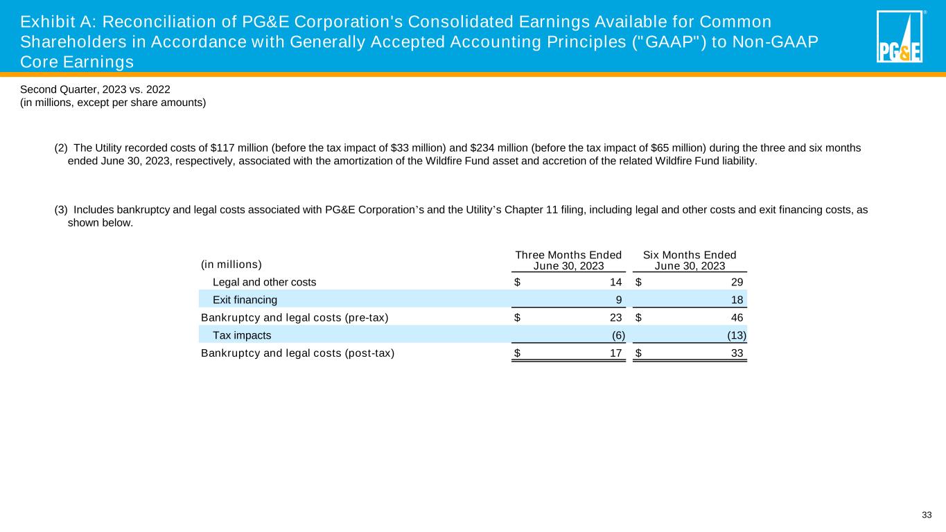 33 Second Quarter, 2023 vs. 2022 (in millions, except per share amounts) (3) Includes bankruptcy and legal costs associated with PG&E Corporation’s and the Utility’s Chapter 11 filing, including legal and other costs and exit financing costs, as shown below. (2) The Utility recorded costs of $117 million (before the tax impact of $33 million) and $234 million (before the tax impact of $65 million) during the three and six months ended June 30, 2023, respectively, associated with the amortization of the Wildfire Fund asset and accretion of the related Wildfire Fund liability. (in millions) Three Months Ended June 30, 2023 Six Months Ended June 30, 2023 Legal and other costs $ 14 $ 29 Exit financing 9 18 Bankruptcy and legal costs (pre-tax) $ 23 $ 46 Tax impacts (6) (13) Bankruptcy and legal costs (post-tax) $ 17 $ 33 Exhibit A: Reconciliation of PG&E Corporation's Consolidated Earnings Available for Common Shareholders in Accordance with Generally Accepted Accounting Principles ("GAAP") to Non-GAAP Core Earnings