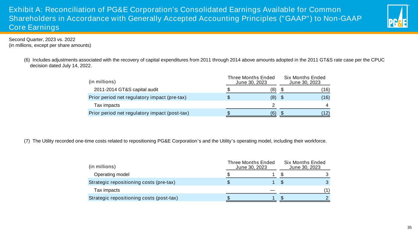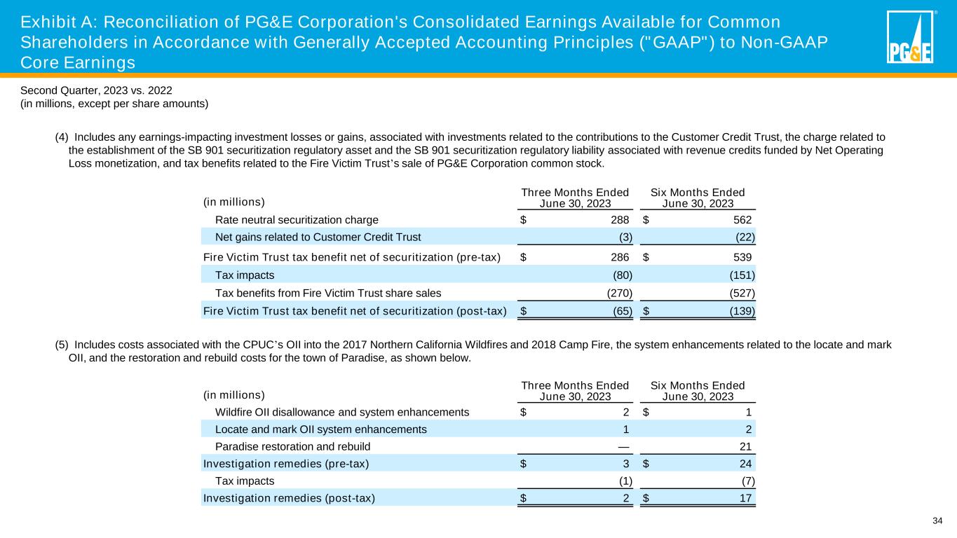 34 Second Quarter, 2023 vs. 2022 (in millions, except per share amounts) (4) Includes any earnings-impacting investment losses or gains, associated with investments related to the contributions to the Customer Credit Trust, the charge related to the establishment of the SB 901 securitization regulatory asset and the SB 901 securitization regulatory liability associated with revenue credits funded by Net Operating Loss monetization, and tax benefits related to the Fire Victim Trust’s sale of PG&E Corporation common stock. (in millions) Three Months Ended June 30, 2023 Six Months Ended June 30, 2023 Wildfire OII disallowance and system enhancements $ 2 $ 1 Locate and mark OII system enhancements 1 2 Paradise restoration and rebuild — 21 Investigation remedies (pre-tax) $ 3 $ 24 Tax impacts (1) (7) Investigation remedies (post-tax) $ 2 $ 17 (5) Includes costs associated with the CPUC’s OII into the 2017 Northern California Wildfires and 2018 Camp Fire, the system enhancements related to the locate and mark OII, and the restoration and rebuild costs for the town of Paradise, as shown below. (in millions) Three Months Ended June 30, 2023 Six Months Ended June 30, 2023 Rate neutral securitization charge $ 288 $ 562 Net gains related to Customer Credit Trust (3) (22) Fire Victim Trust tax benefit net of securitization (pre-tax) $ 286 $ 539 Tax impacts (80) (151) Tax benefits from Fire Victim Trust share sales (270) (527) Fire Victim Trust tax benefit net of securitization (post-tax) $ (65) $ (139) Exhibit A: Reconciliation of PG&E Corporation's Consolidated Earnings Available for Common Shareholders in Accordance with Generally Accepted Accounting Principles ("GAAP") to Non-GAAP Core Earnings
