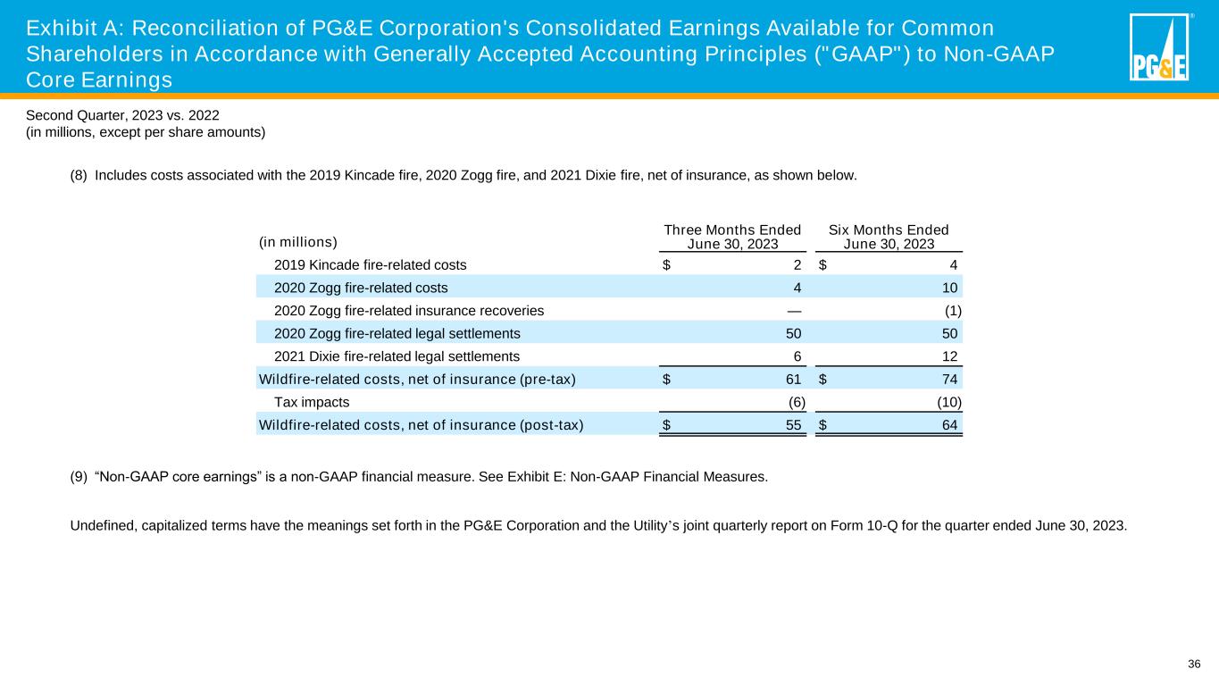 35 Second Quarter, 2023 vs. 2022 (in millions, except per share amounts) (6) Includes adjustments associated with the recovery of capital expenditures from 2011 through 2014 above amounts adopted in the 2011 GT&S rate case per the CPUC decision dated July 14, 2022. (in millions) Three Months Ended June 30, 2023 Six Months Ended June 30, 2023 Operating model $ 1 $ 3 Strategic repositioning costs (pre-tax) $ 1 $ 3 Tax impacts — (1) Strategic repositioning costs (post-tax) $ 1 $ 2 (7) The Utility recorded one-time costs related to repositioning PG&E Corporation’s and the Utility’s operating model, including their workforce. (in millions) Three Months Ended June 30, 2023 Six Months Ended June 30, 2023 2011-2014 GT&S capital audit $ (8) $ (16) Prior period net regulatory impact (pre-tax) $ (8) $ (16) Tax impacts 2 4 Prior period net regulatory impact (post-tax) $ (6) $ (12) Exhibit A: Reconciliation of PG&E Corporation's Consolidated Earnings Available for Common Shareholders in Accordance with Generally Accepted Accounting Principles ("GAAP") to Non-GAAP Core Earnings