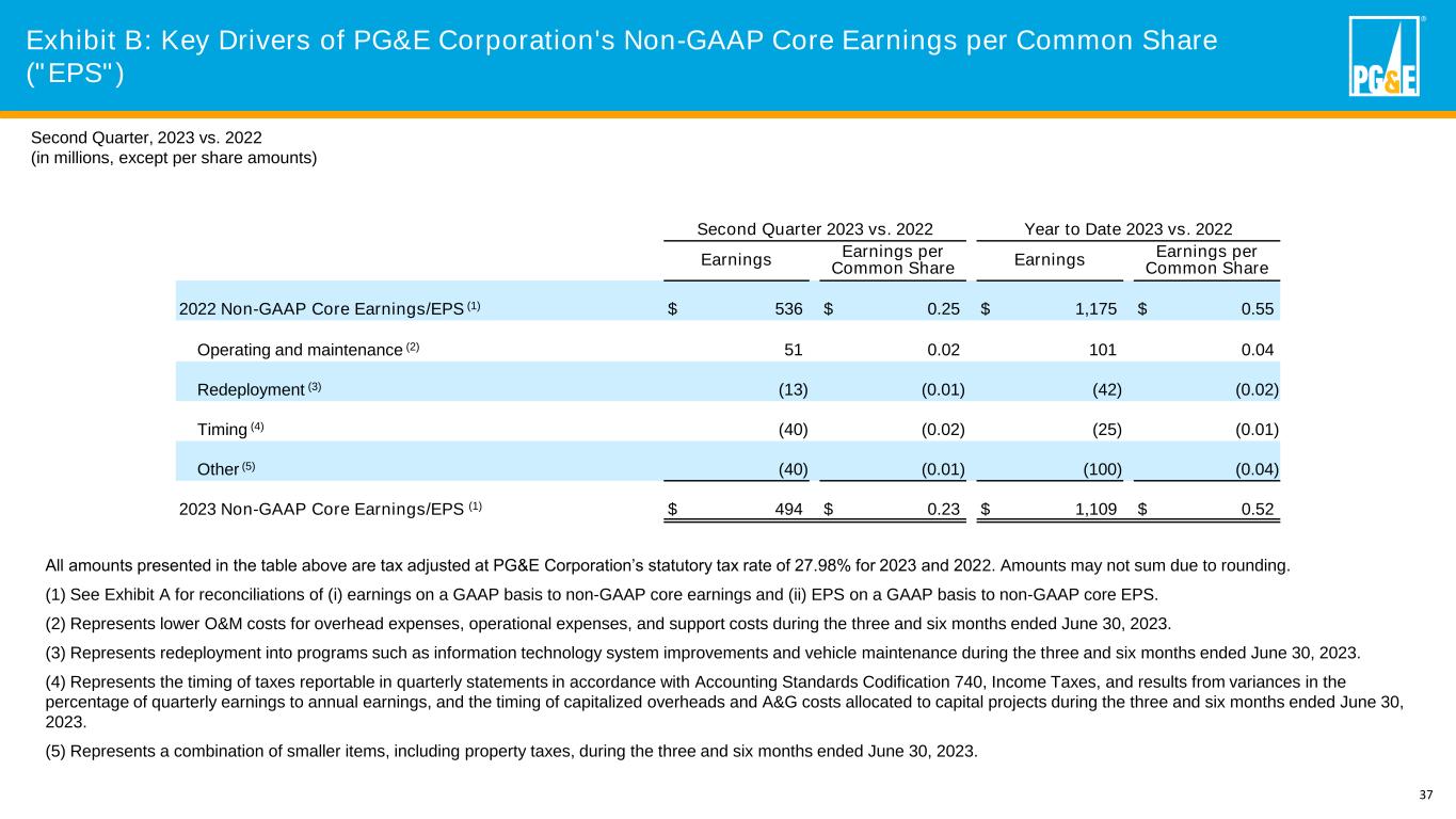 37 All amounts presented in the table above are tax adjusted at PG&E Corporation’s statutory tax rate of 27.98% for 2023 and 2022. Amounts may not sum due to rounding. (1) See Exhibit A for reconciliations of (i) earnings on a GAAP basis to non-GAAP core earnings and (ii) EPS on a GAAP basis to non-GAAP core EPS. (2) Represents lower O&M costs for overhead expenses, operational expenses, and support costs during the three and six months ended June 30, 2023. (3) Represents redeployment into programs such as information technology system improvements and vehicle maintenance during the three and six months ended June 30, 2023. (4) Represents the timing of taxes reportable in quarterly statements in accordance with Accounting Standards Codification 740, Income Taxes, and results from variances in the percentage of quarterly earnings to annual earnings, and the timing of capitalized overheads and A&G costs allocated to capital projects during the three and six months ended June 30, 2023. (5) Represents a combination of smaller items, including property taxes, during the three and six months ended June 30, 2023. Second Quarter 2023 vs. 2022 Year to Date 2023 vs. 2022 Earnings Earnings per Common Share Earnings Earnings per Common Share 2022 Non-GAAP Core Earnings/EPS (1) $ 536 $ 0.25 $ 1,175 $ 0.55 Operating and maintenance (2) 51 0.02 101 0.04 Redeployment (3) (13) (0.01) (42) (0.02) Timing (4) (40) (0.02) (25) (0.01) Other (5) (40) (0.01) (100) (0.04) 2023 Non-GAAP Core Earnings/EPS (1) $ 494 $ 0.23 $ 1,109 $ 0.52 Second Quarter, 2023 vs. 2022 (in millions, except per share amounts) Exhibit B: Key Drivers of PG&E Corporation's Non-GAAP Core Earnings per Common Share ("EPS")