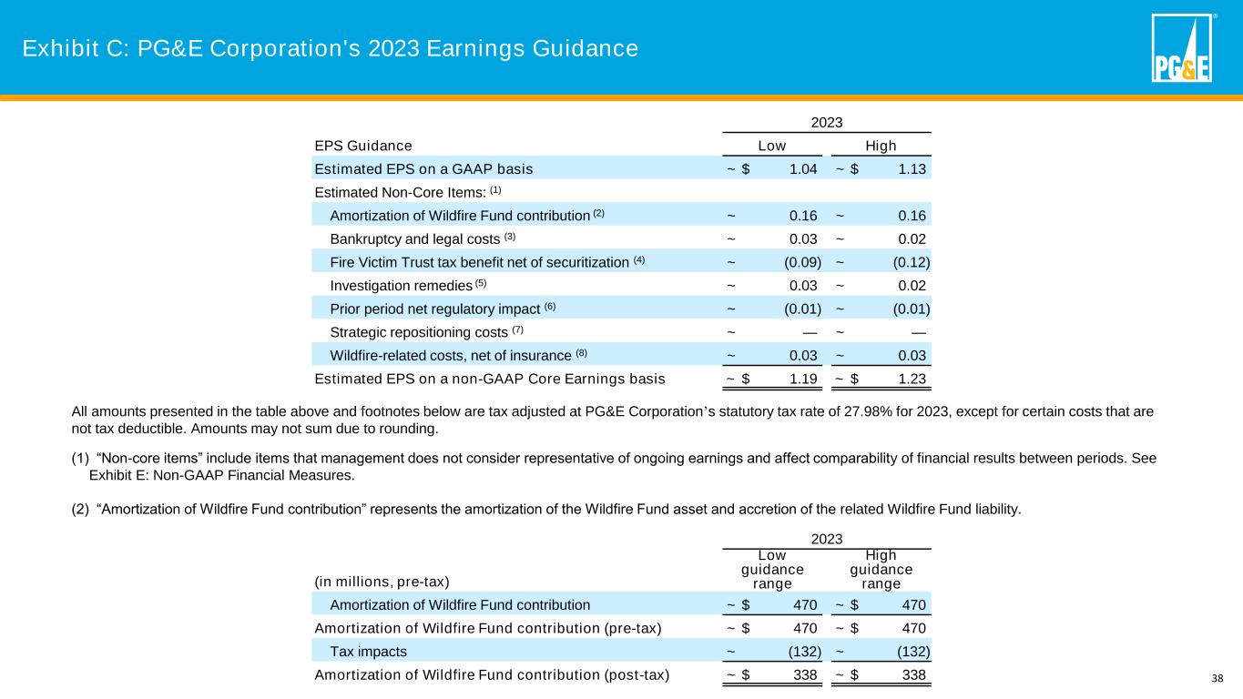 38 2023 EPS Guidance Low High Estimated EPS on a GAAP basis ~ $ 1.04 ~ $ 1.13 Estimated Non-Core Items: (1) Amortization of Wildfire Fund contribution (2) ~ 0.16 ~ 0.16 Bankruptcy and legal costs (3) ~ 0.03 ~ 0.02 Fire Victim Trust tax benefit net of securitization (4) ~ (0.09) ~ (0.12) Investigation remedies (5) ~ 0.03 ~ 0.02 Prior period net regulatory impact (6) ~ (0.01) ~ (0.01) Strategic repositioning costs (7) ~ — ~ — Wildfire-related costs, net of insurance (8) ~ 0.03 ~ 0.03 Estimated EPS on a non-GAAP Core Earnings basis ~ $ 1.19 ~ $ 1.23 All amounts presented in the table above and footnotes below are tax adjusted at PG&E Corporation’s statutory tax rate of 27.98% for 2023, except for certain costs that are not tax deductible. Amounts may not sum due to rounding. (1) “Non-core items” include items that management does not consider representative of ongoing earnings and affect comparability of financial results between periods. See Exhibit E: Non-GAAP Financial Measures. 2023 (in millions, pre-tax) Low guidance range High guidance range Amortization of Wildfire Fund contribution ~ $ 470 ~ $ 470 Amortization of Wildfire Fund contribution (pre-tax) ~ $ 470 ~ $ 470 Tax impacts ~ (132) ~ (132) Amortization of Wildfire Fund contribution (post-tax) ~ $ 338 ~ $ 338 (2) “Amortization of Wildfire Fund contribution” represents the amortization of the Wildfire Fund asset and accretion of the related Wildfire Fund liability. Exhibit C: PG&E Corporation's 2023 Earnings Guidance