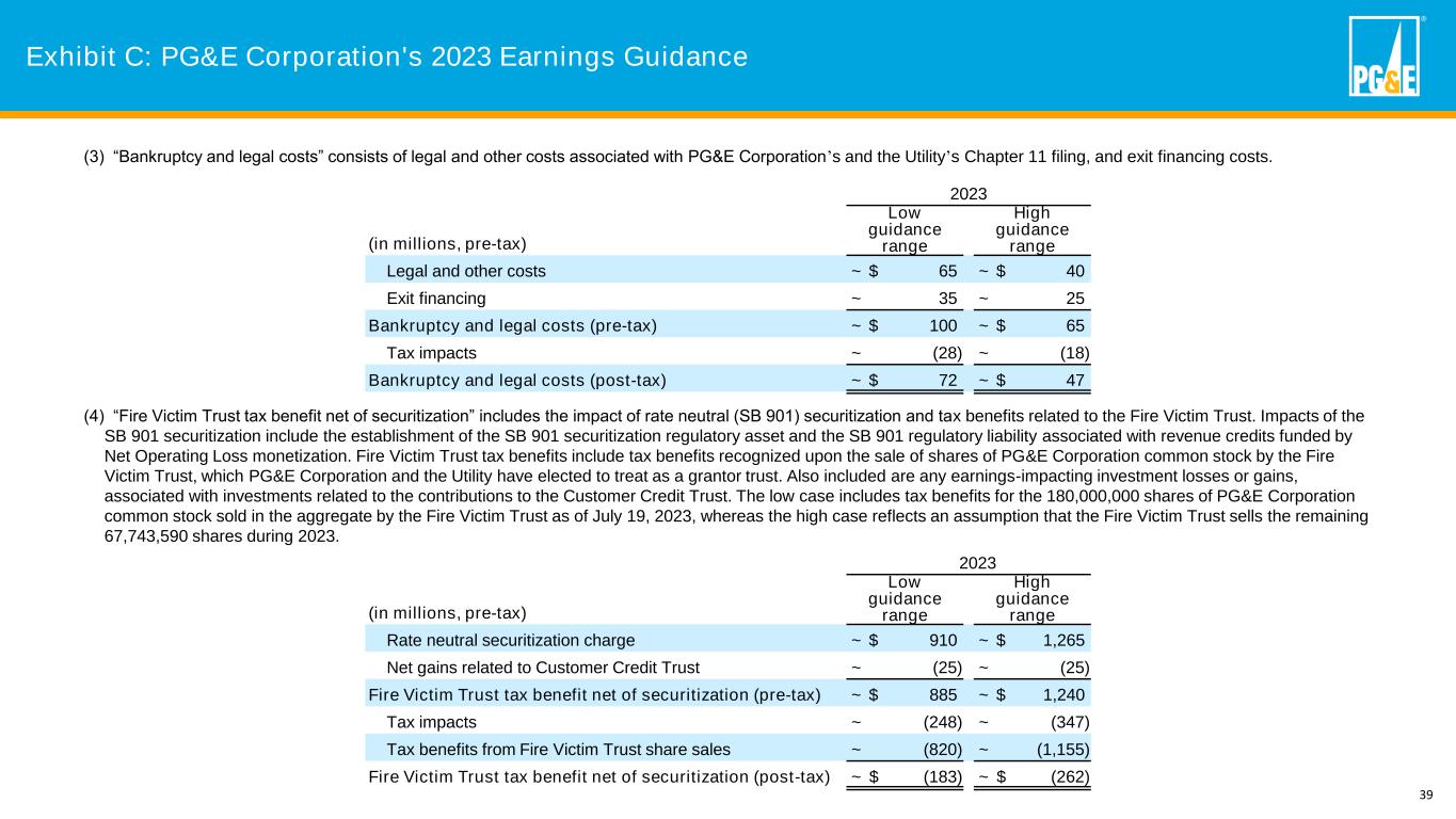 39 Exhibit E: PG&E Corporation's 2020 and 2021 Earnings Guidance (4) “Fire Victim Trust tax benefit net of securitization” includes the impact of rate neutral (SB 901) securitization and tax benefits related to the Fire Victim Trust. Impacts of the SB 901 securitization include the establishment of the SB 901 securitization regulatory asset and the SB 901 regulatory liability associated with revenue credits funded by Net Operating Loss monetization. Fire Victim Trust tax benefits include tax benefits recognized upon the sale of shares of PG&E Corporation common stock by the Fire Victim Trust, which PG&E Corporation and the Utility have elected to treat as a grantor trust. Also included are any earnings-impacting investment losses or gains, associated with investments related to the contributions to the Customer Credit Trust. The low case includes tax benefits for the 180,000,000 shares of PG&E Corporation common stock sold in the aggregate by the Fire Victim Trust as of July 19, 2023, whereas the high case reflects an assumption that the Fire Victim Trust sells the remaining 67,743,590 shares during 2023. (3) “Bankruptcy and legal costs” consists of legal and other costs associated with PG&E Corporation’s and the Utility’s Chapter 11 filing, and exit financing costs. 2023 (in millions, pre-tax) Low guidance range High guidance range Legal and other costs ~ $ 65 ~ $ 40 Exit financing ~ 35 ~ 25 Bankruptcy and legal costs (pre-tax) ~ $ 100 ~ $ 65 Tax impacts ~ (28) ~ (18) Bankruptcy and legal costs (post-tax) ~ $ 72 ~ $ 47 2023 (in millions, pre-tax) Low guidance range High guidance range Rate neutral securitization charge ~ $ 910 ~ $ 1,265 Net gains related to Customer Credit Trust ~ (25) ~ (25) Fire Victim Trust tax benefit net of securitization (pre-tax) ~ $ 885 ~ $ 1,240 Tax impacts ~ (248) ~ (347) Tax benefits from Fire Victim Trust share sales ~ (820) ~ (1,155) Fire Victim Trust tax benefit net of securitization (post-tax) ~ $ (183) ~ $ (262) Exhibit C: PG&E Corporation's 2023 Earnings Guidance