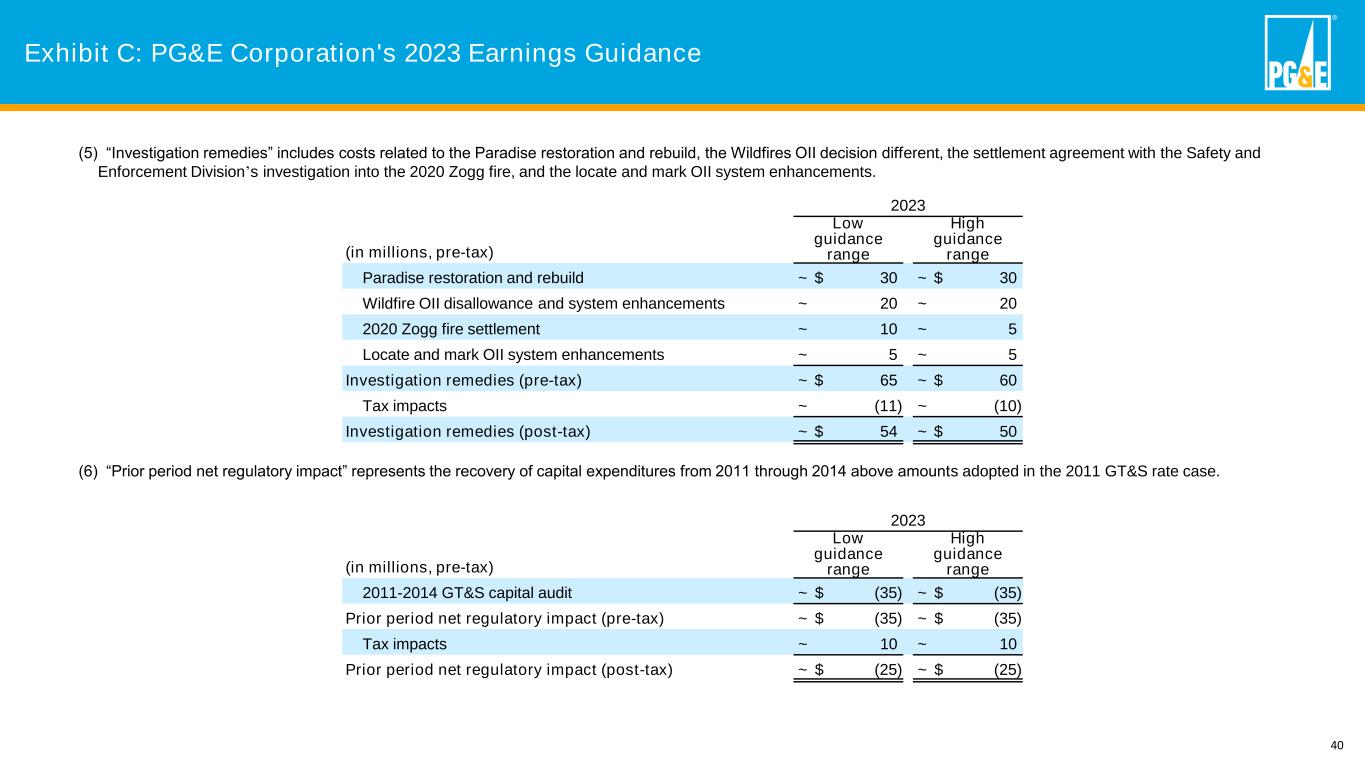 40 (6) “Prior period net regulatory impact” represents the recovery of capital expenditures from 2011 through 2014 above amounts adopted in the 2011 GT&S rate case. (5) “Investigation remedies” includes costs related to the Paradise restoration and rebuild, the Wildfires OII decision different, the settlement agreement with the Safety and Enforcement Division’s investigation into the 2020 Zogg fire, and the locate and mark OII system enhancements. 2023 (in millions, pre-tax) Low guidance range High guidance range Paradise restoration and rebuild ~ $ 30 ~ $ 30 Wildfire OII disallowance and system enhancements ~ 20 ~ 20 2020 Zogg fire settlement ~ 10 ~ 5 Locate and mark OII system enhancements ~ 5 ~ 5 Investigation remedies (pre-tax) ~ $ 65 ~ $ 60 Tax impacts ~ (11) ~ (10) Investigation remedies (post-tax) ~ $ 54 ~ $ 50 2023 (in millions, pre-tax) Low guidance range High guidance range 2011-2014 GT&S capital audit ~ $ (35) ~ $ (35) Prior period net regulatory impact (pre-tax) ~ $ (35) ~ $ (35) Tax impacts ~ 10 ~ 10 Prior period net regulatory impact (post-tax) ~ $ (25) ~ $ (25) Exhibit C: PG&E Corporation's 2023 Earnings Guidance