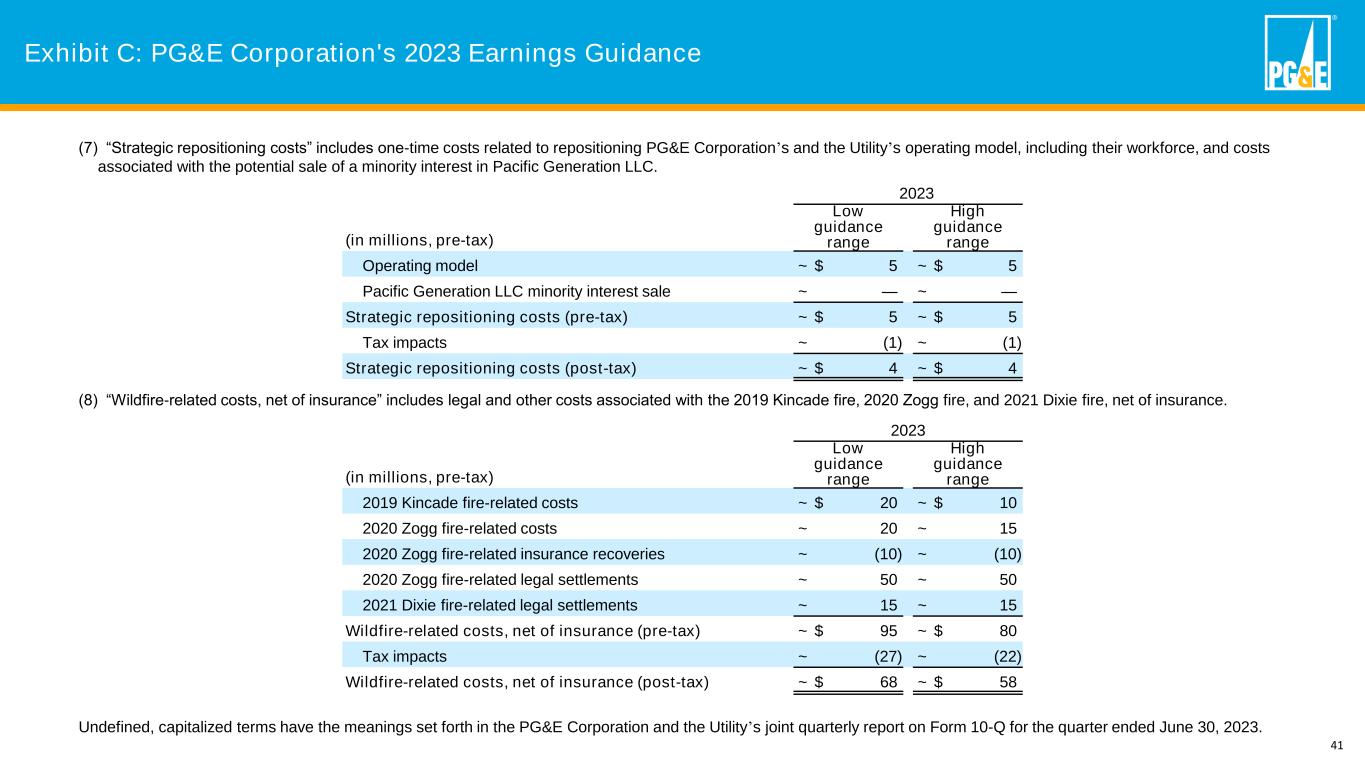41 (7) “Strategic repositioning costs” includes one-time costs related to repositioning PG&E Corporation’s and the Utility’s operating model, including their workforce, and costs associated with the potential sale of a minority interest in Pacific Generation LLC. Undefined, capitalized terms have the meanings set forth in the PG&E Corporation and the Utility’s joint quarterly report on Form 10-Q for the quarter ended June 30, 2023. (8) “Wildfire-related costs, net of insurance” includes legal and other costs associated with the 2019 Kincade fire, 2020 Zogg fire, and 2021 Dixie fire, net of insurance. 2023 (in millions, pre-tax) Low guidance range High guidance range Operating model ~ $ 5 ~ $ 5 Pacific Generation LLC minority interest sale ~ — ~ — Strategic repositioning costs (pre-tax) ~ $ 5 ~ $ 5 Tax impacts ~ (1) ~ (1) Strategic repositioning costs (post-tax) ~ $ 4 ~ $ 4 2023 (in millions, pre-tax) Low guidance range High guidance range 2019 Kincade fire-related costs ~ $ 20 ~ $ 10 2020 Zogg fire-related costs ~ 20 ~ 15 2020 Zogg fire-related insurance recoveries ~ (10) ~ (10) 2020 Zogg fire-related legal settlements ~ 50 ~ 50 2021 Dixie fire-related legal settlements ~ 15 ~ 15 Wildfire-related costs, net of insurance (pre-tax) ~ $ 95 ~ $ 80 Tax impacts ~ (27) ~ (22) Wildfire-related costs, net of insurance (post-tax) ~ $ 68 ~ $ 58 Exhibit C: PG&E Corporation's 2023 Earnings Guidance