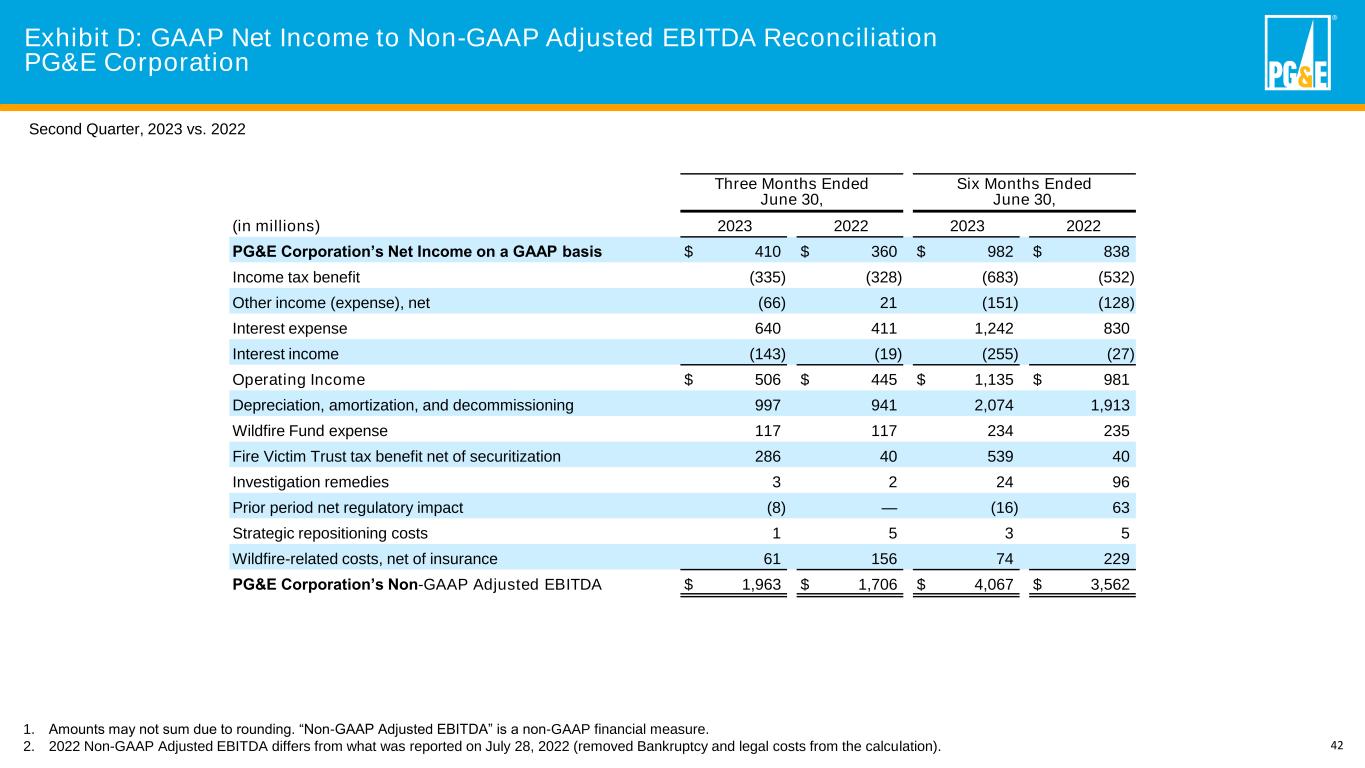 42 Three Months Ended June 30, Six Months Ended June 30, (in millions) 2023 2022 2023 2022 PG&E Corporation’s Net Income on a GAAP basis $ 410 $ 360 $ 982 $ 838 Income tax benefit (335) (328) (683) (532) Other income (expense), net (66) 21 (151) (128) Interest expense 640 411 1,242 830 Interest income (143) (19) (255) (27) Operating Income $ 506 $ 445 $ 1,135 $ 981 Depreciation, amortization, and decommissioning 997 941 2,074 1,913 Wildfire Fund expense 117 117 234 235 Fire Victim Trust tax benefit net of securitization 286 40 539 40 Investigation remedies 3 2 24 96 Prior period net regulatory impact (8) — (16) 63 Strategic repositioning costs 1 5 3 5 Wildfire-related costs, net of insurance 61 156 74 229 PG&E Corporation’s Non-GAAP Adjusted EBITDA $ 1,963 $ 1,706 $ 4,067 $ 3,562 Second Quarter, 2023 vs. 2022 1. Amounts may not sum due to rounding. “Non-GAAP Adjusted EBITDA” is a non-GAAP financial measure. 2. 2022 Non-GAAP Adjusted EBITDA differs from what was reported on July 28, 2022 (removed Bankruptcy and legal costs from the calculation). Exhibit D: GAAP Net Income to Non-GAAP Adjusted EBITDA Reconciliation PG&E Corporation