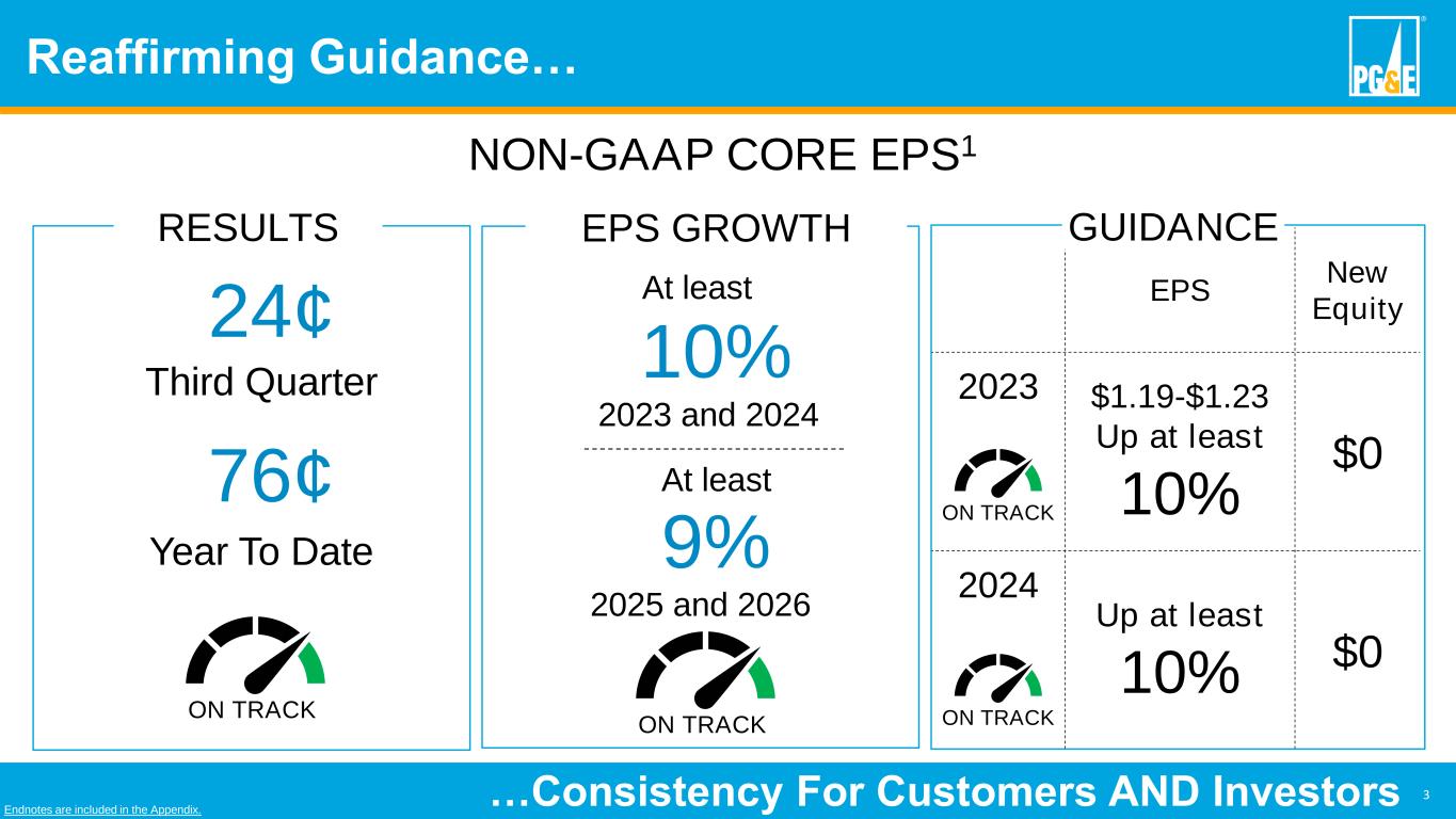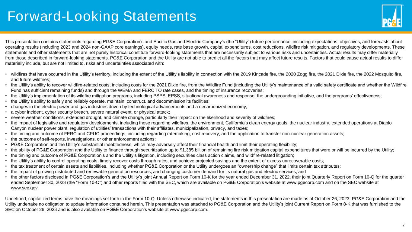 2 Forward-Looking Statements This presentation contains statements regarding PG&E Corporation’s and Pacific Gas and Electric Company’s (the “Utility”) future performance, including expectations, objectives, and forecasts about operating results (including 2023 and 2024 non-GAAP core earnings), equity needs, rate base growth, capital expenditures, cost reductions, wildfire risk mitigation, and regulatory developments. These statements and other statements that are not purely historical constitute forward-looking statements that are necessarily subject to various risks and uncertainties. Actual results may differ materially from those described in forward-looking statements. PG&E Corporation and the Utility are not able to predict all the factors that may affect future results. Factors that could cause actual results to differ materially include, but are not limited to, risks and uncertainties associated with: • wildfires that have occurred in the Utility’s territory, including the extent of the Utility’s liability in connection with the 2019 Kincade fire, the 2020 Zogg fire, the 2021 Dixie fire, the 2022 Mosquito fire, and future wildfires; • the Utility’s ability to recover wildfire-related costs, including costs for the 2021 Dixie fire, from the Wildfire Fund (including the Utility’s maintenance of a valid safety certificate and whether the Wildfire Fund has sufficient remaining funds) and through the WEMA and FERC TO rate cases, and the timing of insurance recoveries; • the Utility’s implementation of its wildfire mitigation programs, including PSPS, EPSS, situational awareness and response, the undergrounding initiative, and the programs’ effectiveness; • the Utility’s ability to safely and reliably operate, maintain, construct, and decommission its facilities; • changes in the electric power and gas industries driven by technological advancements and a decarbonized economy; • a cyber incident, cyber security breach, severe natural event, or physical attack; • severe weather conditions, extended drought, and climate change, particularly their impact on the likelihood and severity of wildfires; • the impact of legislative and regulatory developments, including those regarding wildfires, the environment, California’s clean energy goals, the nuclear industry, extended operations at Diablo Canyon nuclear power plant, regulation of utilities’ transactions with their affiliates, municipalization, privacy, and taxes; • the timing and outcome of FERC and CPUC proceedings, including regarding ratemaking, cost recovery, and the application to transfer non-nuclear generation assets; • the outcome of self-reports, investigations, or other enforcement actions; • PG&E Corporation and the Utility’s substantial indebtedness, which may adversely affect their financial health and limit their operating flexibility; • the ability of PG&E Corporation and the Utility to finance through securitization up to $1.385 billion of remaining fire risk mitigation capital expenditures that were or will be incurred by the Utility; • the timing and outcome of PG&E Corporation’s and the Utility’s litigation, including securities class action claims, and wildfire-related litigation; • the Utility’s ability to control operating costs, timely recover costs through rates, and achieve projected savings and the extent of excess unrecoverable costs; • the tax treatment of certain assets and liabilities, including whether PG&E Corporation or the Utility undergoes an “ownership change” that limits certain tax attributes; • the impact of growing distributed and renewable generation resources, and changing customer demand for its natural gas and electric services; and • the other factors disclosed in PG&E Corporation’s and the Utility’s joint Annual Report on Form 10-K for the year ended December 31, 2022, their joint Quarterly Report on Form 10-Q for the quarter ended September 30, 2023 (the “Form 10-Q”) and other reports filed with the SEC, which are available on PG&E Corporation’s website at www.pgecorp.com and on the SEC website at www.sec.gov. Undefined, capitalized terms have the meanings set forth in the Form 10-Q. Unless otherwise indicated, the statements in this presentation are made as of October 26, 2023. PG&E Corporation and the Utility undertake no obligation to update information contained herein. This presentation was attached to PG&E Corporation and the Utility’s joint Current Report on Form 8-K that was furnished to the SEC on October 26, 2023 and is also available on PG&E Corporation’s website at www.pgecorp.com.