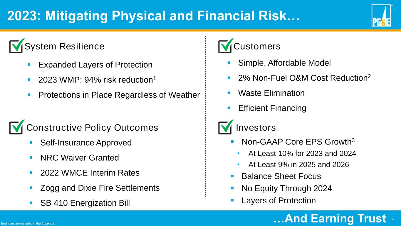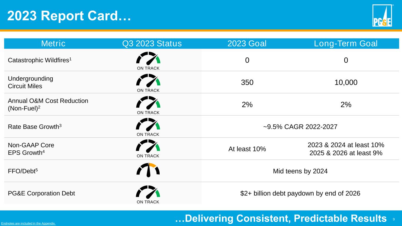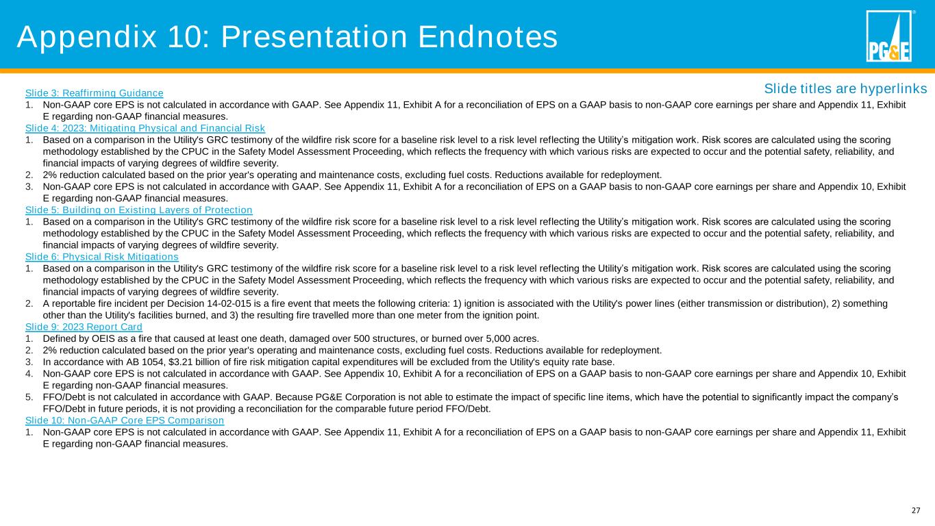 27 Slide titles are hyperlinksSlide 3: Reaffirming Guidance 1. Non-GAAP core EPS is not calculated in accordance with GAAP. See Appendix 11, Exhibit A for a reconciliation of EPS on a GAAP basis to non-GAAP core earnings per share and Appendix 11, Exhibit E regarding non-GAAP financial measures. Slide 4: 2023: Mitigating Physical and Financial Risk 1. Based on a comparison in the Utility's GRC testimony of the wildfire risk score for a baseline risk level to a risk level reflecting the Utility’s mitigation work. Risk scores are calculated using the scoring methodology established by the CPUC in the Safety Model Assessment Proceeding, which reflects the frequency with which various risks are expected to occur and the potential safety, reliability, and financial impacts of varying degrees of wildfire severity. 2. 2% reduction calculated based on the prior year's operating and maintenance costs, excluding fuel costs. Reductions available for redeployment. 3. Non-GAAP core EPS is not calculated in accordance with GAAP. See Appendix 11, Exhibit A for a reconciliation of EPS on a GAAP basis to non-GAAP core earnings per share and Appendix 10, Exhibit E regarding non-GAAP financial measures. Slide 5: Building on Existing Layers of Protection 1. Based on a comparison in the Utility's GRC testimony of the wildfire risk score for a baseline risk level to a risk level reflecting the Utility’s mitigation work. Risk scores are calculated using the scoring methodology established by the CPUC in the Safety Model Assessment Proceeding, which reflects the frequency with which various risks are expected to occur and the potential safety, reliability, and financial impacts of varying degrees of wildfire severity. Slide 6: Physical Risk Mitigations 1. Based on a comparison in the Utility's GRC testimony of the wildfire risk score for a baseline risk level to a risk level reflecting the Utility’s mitigation work. Risk scores are calculated using the scoring methodology established by the CPUC in the Safety Model Assessment Proceeding, which reflects the frequency with which various risks are expected to occur and the potential safety, reliability, and financial impacts of varying degrees of wildfire severity. 2. A reportable fire incident per Decision 14-02-015 is a fire event that meets the following criteria: 1) ignition is associated with the Utility's power lines (either transmission or distribution), 2) something other than the Utility's facilities burned, and 3) the resulting fire travelled more than one meter from the ignition point. Slide 9: 2023 Report Card 1. Defined by OEIS as a fire that caused at least one death, damaged over 500 structures, or burned over 5,000 acres. 2. 2% reduction calculated based on the prior year's operating and maintenance costs, excluding fuel costs. Reductions available for redeployment. 3. In accordance with AB 1054, $3.21 billion of fire risk mitigation capital expenditures will be excluded from the Utility's equity rate base. 4. Non-GAAP core EPS is not calculated in accordance with GAAP. See Appendix 10, Exhibit A for a reconciliation of EPS on a GAAP basis to non-GAAP core earnings per share and Appendix 10, Exhibit E regarding non-GAAP financial measures. 5. FFO/Debt is not calculated in accordance with GAAP. Because PG&E Corporation is not able to estimate the impact of specific line items, which have the potential to significantly impact the company’s FFO/Debt in future periods, it is not providing a reconciliation for the comparable future period FFO/Debt. Slide 10: Non-GAAP Core EPS Comparison 1. Non-GAAP core EPS is not calculated in accordance with GAAP. See Appendix 11, Exhibit A for a reconciliation of EPS on a GAAP basis to non-GAAP core earnings per share and Appendix 11, Exhibit E regarding non-GAAP financial measures. Appendix 10: Presentation Endnotes