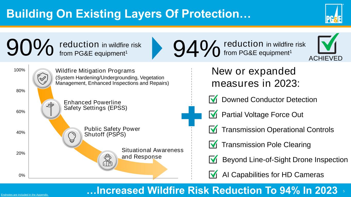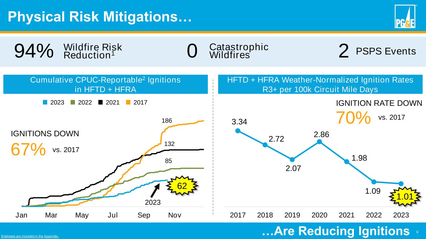 5 Endnotes are included in the Appendix. Building On Existing Layers Of Protection… …Increased Wildfire Risk Reduction To 94% In 2023 reduction in wildfire risk from PG&E equipment1 90% 94% reduction in wildfire risk from PG&E equipment1 100% 80% 60% 40% 20% 0% Wildfire Mitigation Programs (System Hardening/Undergrounding, Vegetation Management, Enhanced Inspections and Repairs) Enhanced Powerline Safety Settings (EPSS) Situational Awareness and Response Public Safety Power Shutoff (PSPS) New or expanded measures in 2023: Transmission Pole Clearing Transmission Operational Controls Partial Voltage Force Out Downed Conductor Detection Beyond Line-of-Sight Drone Inspection AI Capabilities for HD Cameras ACHIEVED