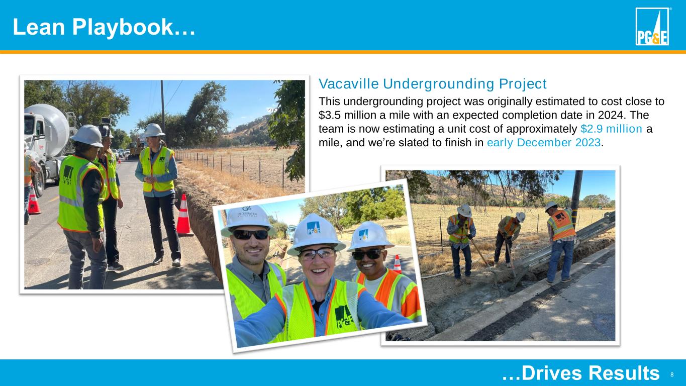 8 Lean Playbook… …Drives Results Vacaville Undergrounding Project This undergrounding project was originally estimated to cost close to $3.5 million a mile with an expected completion date in 2024. The team is now estimating a unit cost of approximately $2.9 million a mile, and we’re slated to finish in early December 2023.
