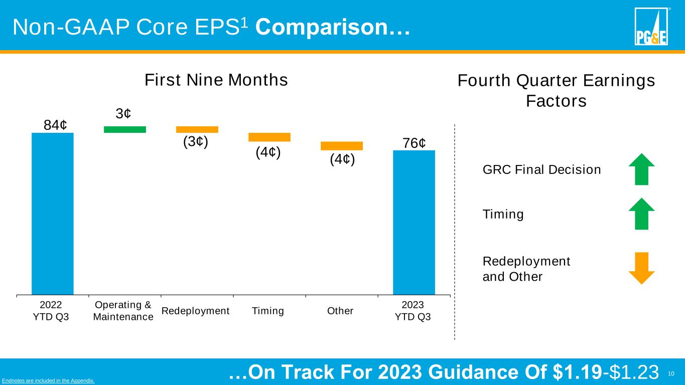 9 Endnotes are included in the Appendix. Metric Q3 2023 Status 2023 Goal Long-Term Goal Catastrophic Wildfires1 0 0 Undergrounding Circuit Miles 350 10,000 Annual O&M Cost Reduction (Non-Fuel)2 2% 2% Rate Base Growth3 ~9.5% CAGR 2022-2027 Non-GAAP Core EPS Growth4 At least 10% 2023 & 2024 at least 10% 2025 & 2026 at least 9% FFO/Debt5 Mid teens by 2024 PG&E Corporation Debt $2+ billion debt paydown by end of 2026 2023 Report Card… …Delivering Consistent, Predictable Results ON TRACK ON TRACK ON TRACK ON TRACK ON TRACK ON TRACK