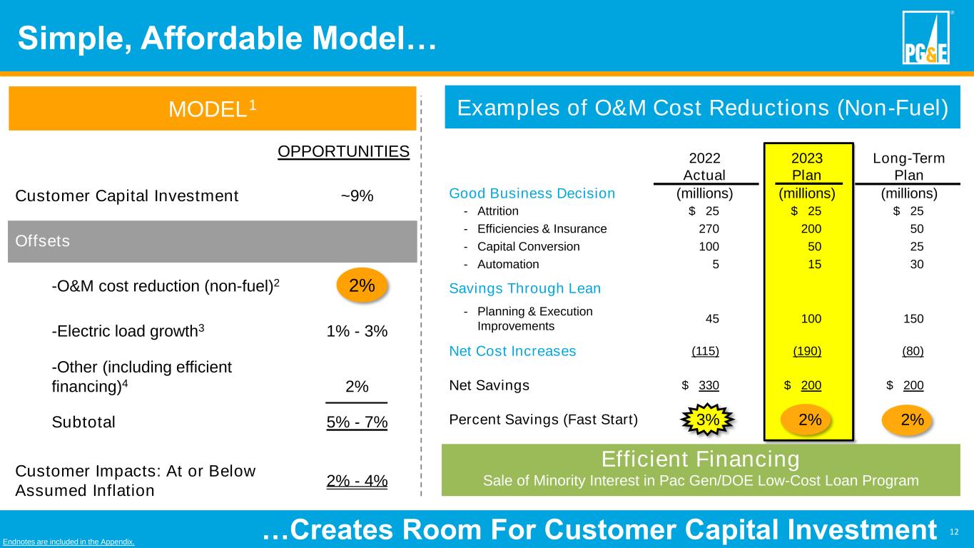 12 Endnotes are included in the Appendix. Simple, Affordable Model… …Creates Room For Customer Capital Investment Examples of O&M Cost Reductions (Non-Fuel) Efficient Financing Sale of Minority Interest in Pac Gen/DOE Low-Cost Loan Program 2022 Actual 2023 Plan Long-Term Plan Good Business Decision (millions) (millions) (millions) - Attrition $ 25 $ 25 $ 25 - Efficiencies & Insurance 270 200 50 - Capital Conversion 100 50 25 - Automation 5 15 30 Savings Through Lean - Planning & Execution Improvements 45 100 150 Net Cost Increases (115) (190) (80) Net Savings $ 330 $ 200 $ 200 Percent Savings (Fast Start) 3% 2% 2% MODEL1 OPPORTUNITIES Customer Capital Investment ~9% Offsets -O&M cost reduction (non-fuel)2 2% -Electric load growth3 1% - 3% -Other (including efficient financing)4 2% Subtotal 5% - 7% Customer Impacts: At or Below Assumed Inflation 2% - 4% 2