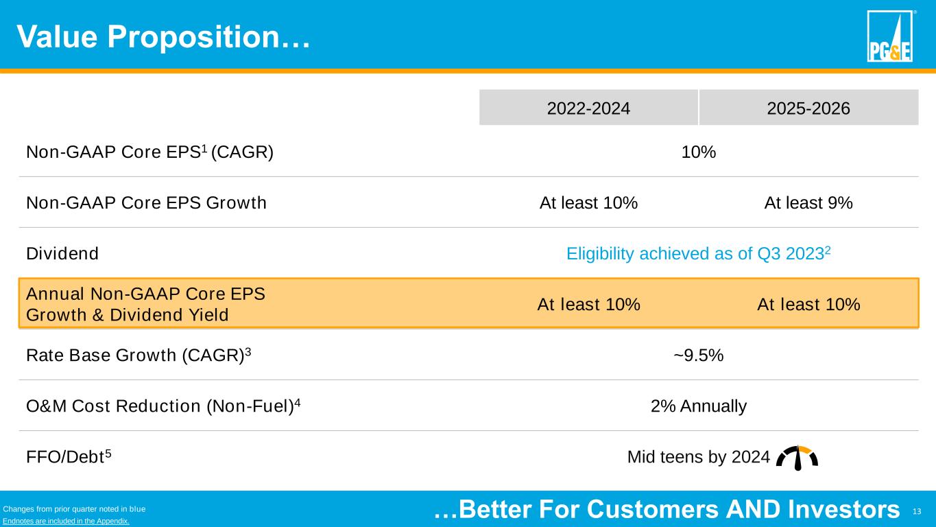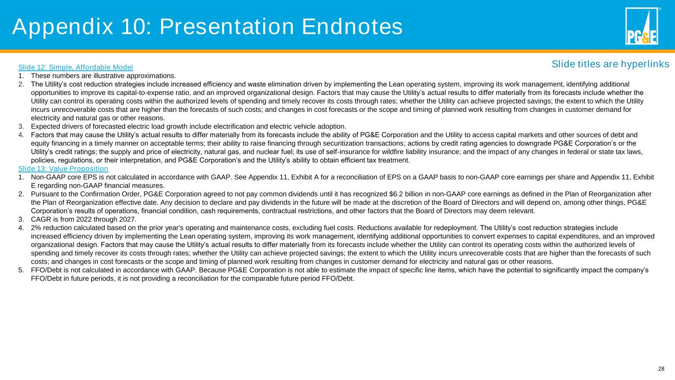 28 Slide titles are hyperlinksSlide 12: Simple, Affordable Model 1. These numbers are illustrative approximations. 2. The Utility’s cost reduction strategies include increased efficiency and waste elimination driven by implementing the Lean operating system, improving its work management, identifying additional opportunities to improve its capital-to-expense ratio, and an improved organizational design. Factors that may cause the Utility’s actual results to differ materially from its forecasts include whether the Utility can control its operating costs within the authorized levels of spending and timely recover its costs through rates; whether the Utility can achieve projected savings; the extent to which the Utility incurs unrecoverable costs that are higher than the forecasts of such costs; and changes in cost forecasts or the scope and timing of planned work resulting from changes in customer demand for electricity and natural gas or other reasons. 3. Expected drivers of forecasted electric load growth include electrification and electric vehicle adoption. 4. Factors that may cause the Utility’s actual results to differ materially from its forecasts include the ability of PG&E Corporation and the Utility to access capital markets and other sources of debt and equity financing in a timely manner on acceptable terms; their ability to raise financing through securitization transactions; actions by credit rating agencies to downgrade PG&E Corporation’s or the Utility’s credit ratings; the supply and price of electricity, natural gas, and nuclear fuel; its use of self-insurance for wildfire liability insurance; and the impact of any changes in federal or state tax laws, policies, regulations, or their interpretation, and PG&E Corporation’s and the Utility’s ability to obtain efficient tax treatment. Slide 13: Value Proposition 1. Non-GAAP core EPS is not calculated in accordance with GAAP. See Appendix 11, Exhibit A for a reconciliation of EPS on a GAAP basis to non-GAAP core earnings per share and Appendix 11, Exhibit E regarding non-GAAP financial measures. 2. Pursuant to the Confirmation Order, PG&E Corporation agreed to not pay common dividends until it has recognized $6.2 billion in non-GAAP core earnings as defined in the Plan of Reorganization after the Plan of Reorganization effective date. Any decision to declare and pay dividends in the future will be made at the discretion of the Board of Directors and will depend on, among other things, PG&E Corporation’s results of operations, financial condition, cash requirements, contractual restrictions, and other factors that the Board of Directors may deem relevant. 3. CAGR is from 2022 through 2027. 4. 2% reduction calculated based on the prior year's operating and maintenance costs, excluding fuel costs. Reductions available for redeployment. The Utility’s cost reduction strategies include increased efficiency driven by implementing the Lean operating system, improving its work management, identifying additional opportunities to convert expenses to capital expenditures, and an improved organizational design. Factors that may cause the Utility’s actual results to differ materially from its forecasts include whether the Utility can control its operating costs within the authorized levels of spending and timely recover its costs through rates; whether the Utility can achieve projected savings; the extent to which the Utility incurs unrecoverable costs that are higher than the forecasts of such costs; and changes in cost forecasts or the scope and timing of planned work resulting from changes in customer demand for electricity and natural gas or other reasons. 5. FFO/Debt is not calculated in accordance with GAAP. Because PG&E Corporation is not able to estimate the impact of specific line items, which have the potential to significantly impact the company’s FFO/Debt in future periods, it is not providing a reconciliation for the comparable future period FFO/Debt. Appendix 10: Presentation Endnotes