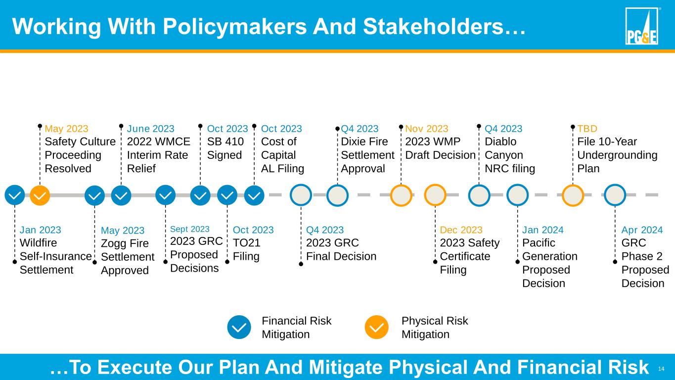 14 Working With Policymakers And Stakeholders… …To Execute Our Plan And Mitigate Physical And Financial Risk Financial Risk Mitigation Physical Risk Mitigation June 2023 2022 WMCE Interim Rate Relief Jan 2024 Pacific Generation Proposed Decision May 2023 Safety Culture Proceeding Resolved Jan 2023 Wildfire Self-Insurance Settlement May 2023 Zogg Fire Settlement Approved Oct 2023 SB 410 Signed Q4 2023 Diablo Canyon NRC filing Apr 2024 GRC Phase 2 Proposed Decision Dec 2023 2023 Safety Certificate Filing TBD File 10-Year Undergrounding Plan Nov 2023 2023 WMP Draft Decision Q4 2023 Dixie Fire Settlement Approval Sept 2023 2023 GRC Proposed Decisions Oct 2023 TO21 Filing Q4 2023 2023 GRC Final Decision Oct 2023 Cost of Capital AL Filing