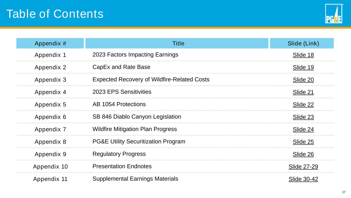 17 Table of Contents Appendix # Title Slide (Link) Appendix 1 2023 Factors Impacting Earnings Slide 18 Appendix 2 CapEx and Rate Base Slide 19 Appendix 3 Expected Recovery of Wildfire-Related Costs Slide 20 Appendix 4 2023 EPS Sensitivities Slide 21 Appendix 5 AB 1054 Protections Slide 22 Appendix 6 SB 846 Diablo Canyon Legislation Slide 23 Appendix 7 Wildfire Mitigation Plan Progress Slide 24 Appendix 8 PG&E Utility Securitization Program Slide 25 Appendix 9 Regulatory Progress Slide 26 Appendix 10 Presentation Endnotes Slide 27-29 Appendix 11 Supplemental Earnings Materials Slide 30-42