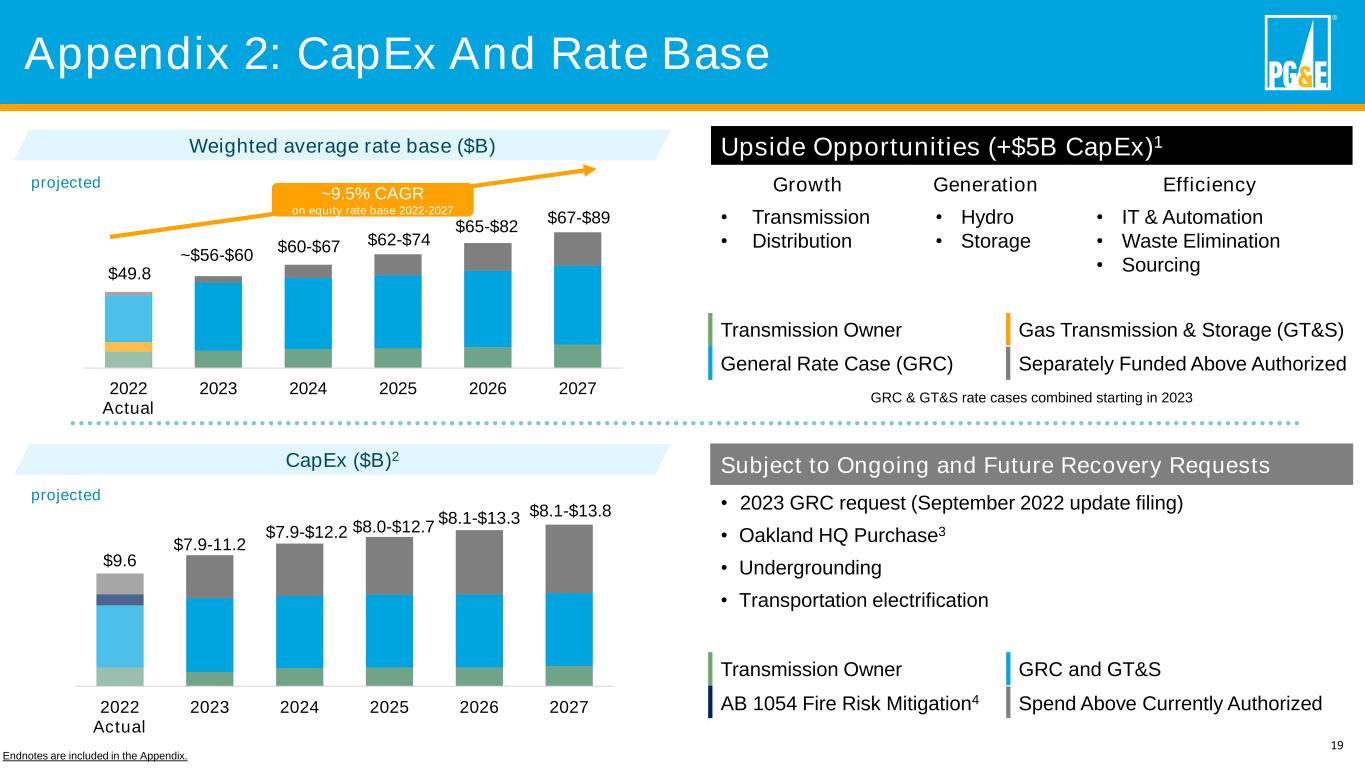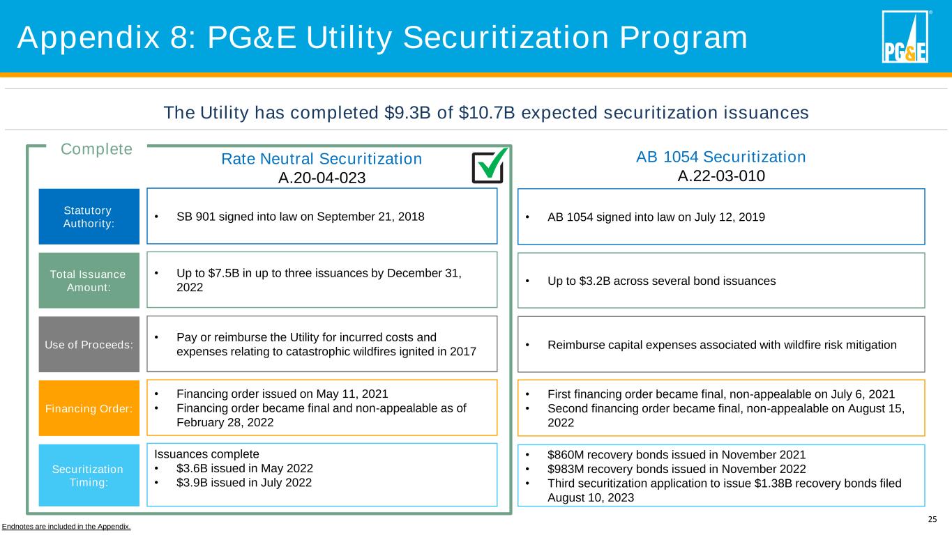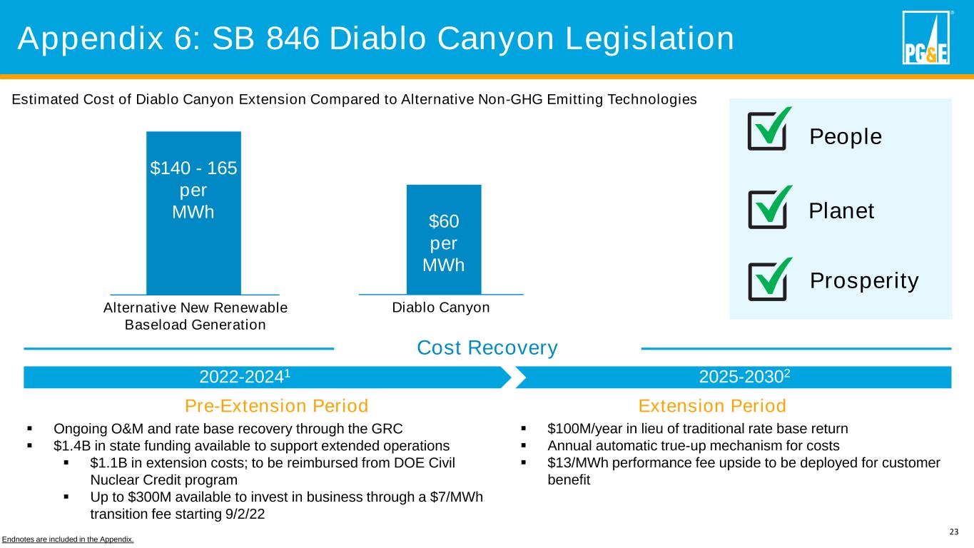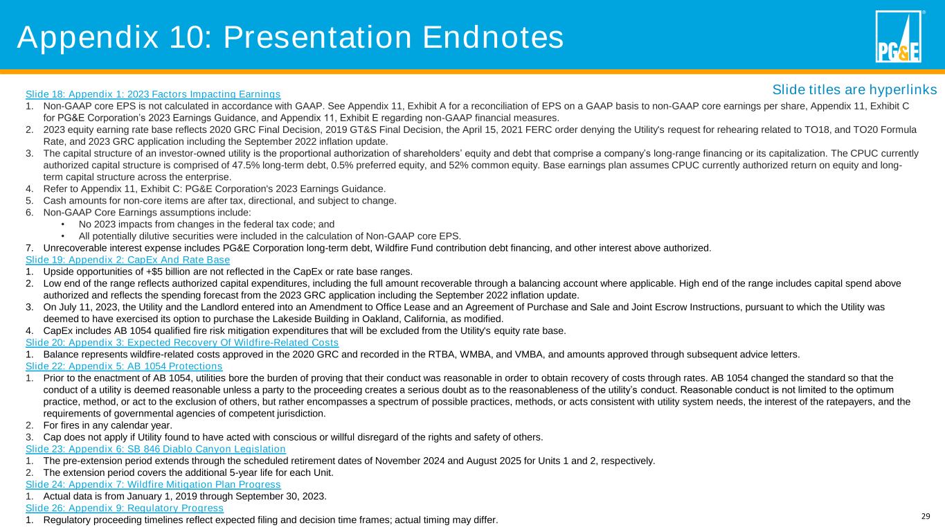 29 Slide titles are hyperlinks Appendix 10: Presentation Endnotes Slide 18: Appendix 1: 2023 Factors Impacting Earnings 1. Non-GAAP core EPS is not calculated in accordance with GAAP. See Appendix 11, Exhibit A for a reconciliation of EPS on a GAAP basis to non-GAAP core earnings per share, Appendix 11, Exhibit C for PG&E Corporation’s 2023 Earnings Guidance, and Appendix 11, Exhibit E regarding non-GAAP financial measures. 2. 2023 equity earning rate base reflects 2020 GRC Final Decision, 2019 GT&S Final Decision, the April 15, 2021 FERC order denying the Utility's request for rehearing related to TO18, and TO20 Formula Rate, and 2023 GRC application including the September 2022 inflation update. 3. The capital structure of an investor-owned utility is the proportional authorization of shareholders’ equity and debt that comprise a company’s long-range financing or its capitalization. The CPUC currently authorized capital structure is comprised of 47.5% long-term debt, 0.5% preferred equity, and 52% common equity. Base earnings plan assumes CPUC currently authorized return on equity and long- term capital structure across the enterprise. 4. Refer to Appendix 11, Exhibit C: PG&E Corporation's 2023 Earnings Guidance. 5. Cash amounts for non-core items are after tax, directional, and subject to change. 6. Non-GAAP Core Earnings assumptions include: • No 2023 impacts from changes in the federal tax code; and • All potentially dilutive securities were included in the calculation of Non-GAAP core EPS. 7. Unrecoverable interest expense includes PG&E Corporation long-term debt, Wildfire Fund contribution debt financing, and other interest above authorized. Slide 19: Appendix 2: CapEx And Rate Base 1. Upside opportunities of +$5 billion are not reflected in the CapEx or rate base ranges. 2. Low end of the range reflects authorized capital expenditures, including the full amount recoverable through a balancing account where applicable. High end of the range includes capital spend above authorized and reflects the spending forecast from the 2023 GRC application including the September 2022 inflation update. 3. On July 11, 2023, the Utility and the Landlord entered into an Amendment to Office Lease and an Agreement of Purchase and Sale and Joint Escrow Instructions, pursuant to which the Utility was deemed to have exercised its option to purchase the Lakeside Building in Oakland, California, as modified. 4. CapEx includes AB 1054 qualified fire risk mitigation expenditures that will be excluded from the Utility's equity rate base. Slide 20: Appendix 3: Expected Recovery Of Wildfire-Related Costs 1. Balance represents wildfire-related costs approved in the 2020 GRC and recorded in the RTBA, WMBA, and VMBA, and amounts approved through subsequent advice letters. Slide 22: Appendix 5: AB 1054 Protections 1. Prior to the enactment of AB 1054, utilities bore the burden of proving that their conduct was reasonable in order to obtain recovery of costs through rates. AB 1054 changed the standard so that the conduct of a utility is deemed reasonable unless a party to the proceeding creates a serious doubt as to the reasonableness of the utility’s conduct. Reasonable conduct is not limited to the optimum practice, method, or act to the exclusion of others, but rather encompasses a spectrum of possible practices, methods, or acts consistent with utility system needs, the interest of the ratepayers, and the requirements of governmental agencies of competent jurisdiction. 2. For fires in any calendar year. 3. Cap does not apply if Utility found to have acted with conscious or willful disregard of the rights and safety of others. Slide 23: Appendix 6: SB 846 Diablo Canyon Legislation 1. The pre-extension period extends through the scheduled retirement dates of November 2024 and August 2025 for Units 1 and 2, respectively. 2. The extension period covers the additional 5-year life for each Unit. Slide 24: Appendix 7: Wildfire Mitigation Plan Progress 1. Actual data is from January 1, 2019 through September 30, 2023. Slide 26: Appendix 9: Regulatory Progress 1. Regulatory proceeding timelines reflect expected filing and decision time frames; actual timing may differ.